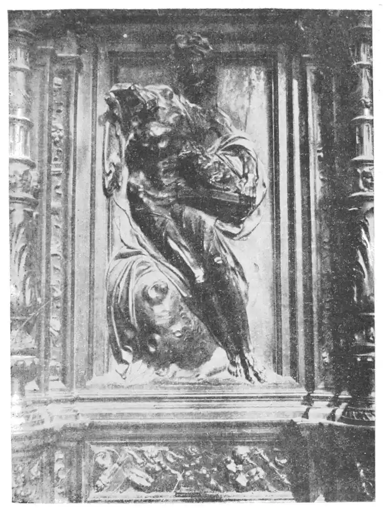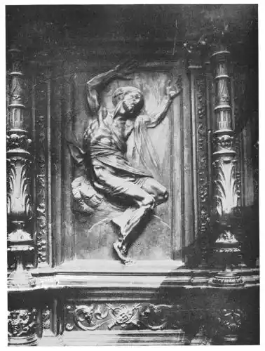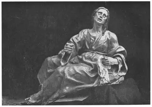 The altar-screen of the chapel of La Caridad is even finer than that of the cathedral. The subject (Plate 152) is the Burial of Christ. The figures placed around the Divine Body, which is being lowered into the tomb, are splendidly grouped, and there is great unity in the composition of the scene. The polychrome was carried out by Juan de Valdés Leal, while Murillo aided that painter with his counsel and possibly with his brush. The architect Bernardo de Puieda contracted for the work, receiving for it 12,500 ducats. Of this sum 11,000 ducats went to Valdés Leal, but we have no knowledge as to the amount appointed to Roldan, though a contemporary writer remarks that “it was very little.” This is what we should expect, for we read of Roldan as being entirely engrossed in his art. He lived in a country house outside Seville, where he enjoyed the beauties of nature, only going to the city when compelled. Then he rode on a small donkey, and occupied his time while journeying in making small models in clay or wax, which he always carried with him.