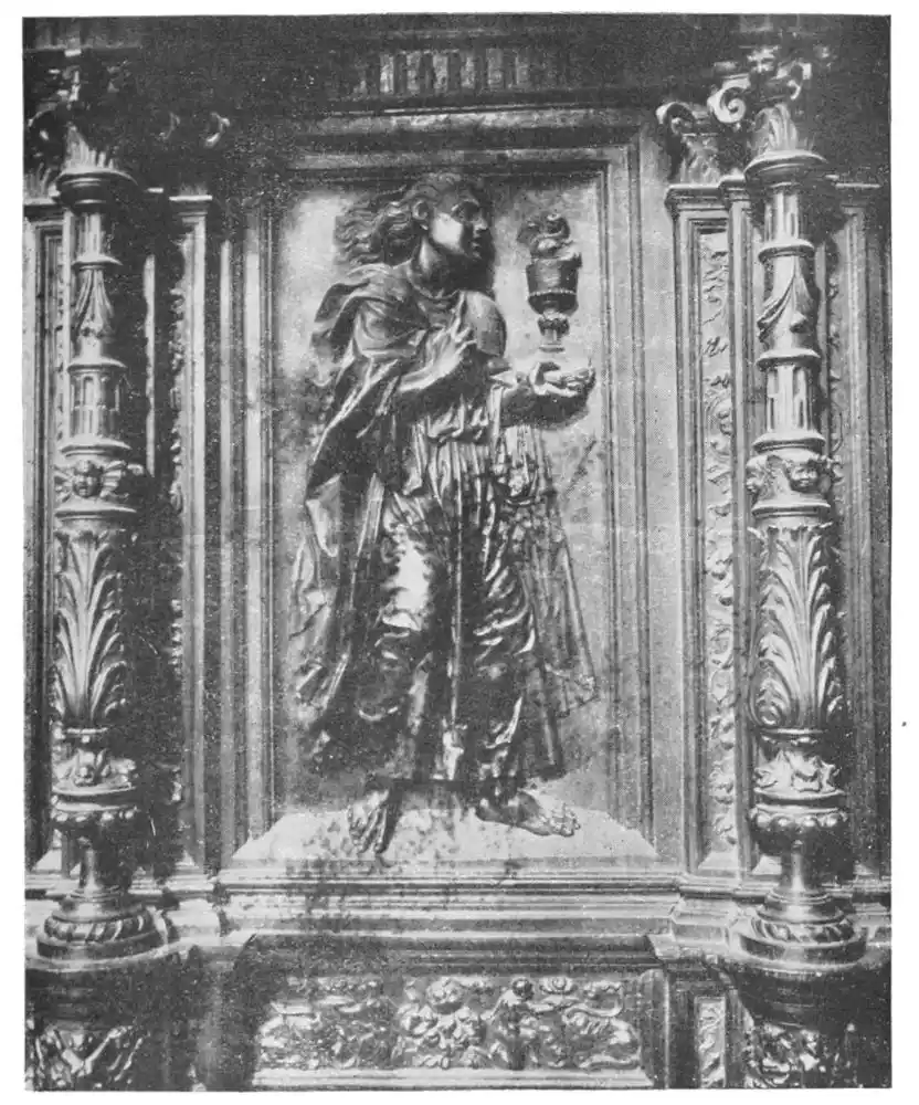 The consideration of these Christs of the Passion and the Conceptions has carried us away from the chronological order of Montañés’ work. The years 1615 to 1622 were occupied with the execution of the screen of the high altar and four altars in the nave of the Church of Santa Clara, of which the statues and the sculptures are the work of Montañés. The carvings are of great{139} merit, but unfortunately the screen of the high altar was redecorated after the death of the master and almost ruined. It has fine statues of Santa Clara, of the Christ and God the Father, as well as a Conception, which formerly was on one of the side altars, four bas-reliefs and a number of statuettes, among which special attention should be given to the very beautiful group of angels, who carry the lamps of the Holy Sacrament. On the side altars are the figures of St. Francis, St. John the Baptist, and St. John the Evangelist.