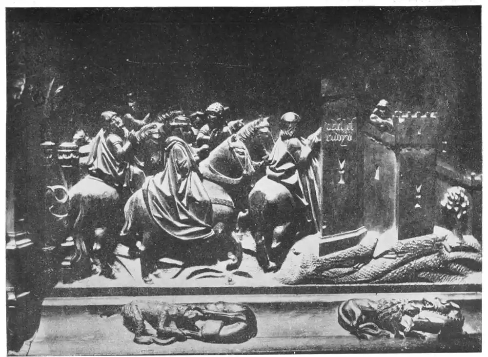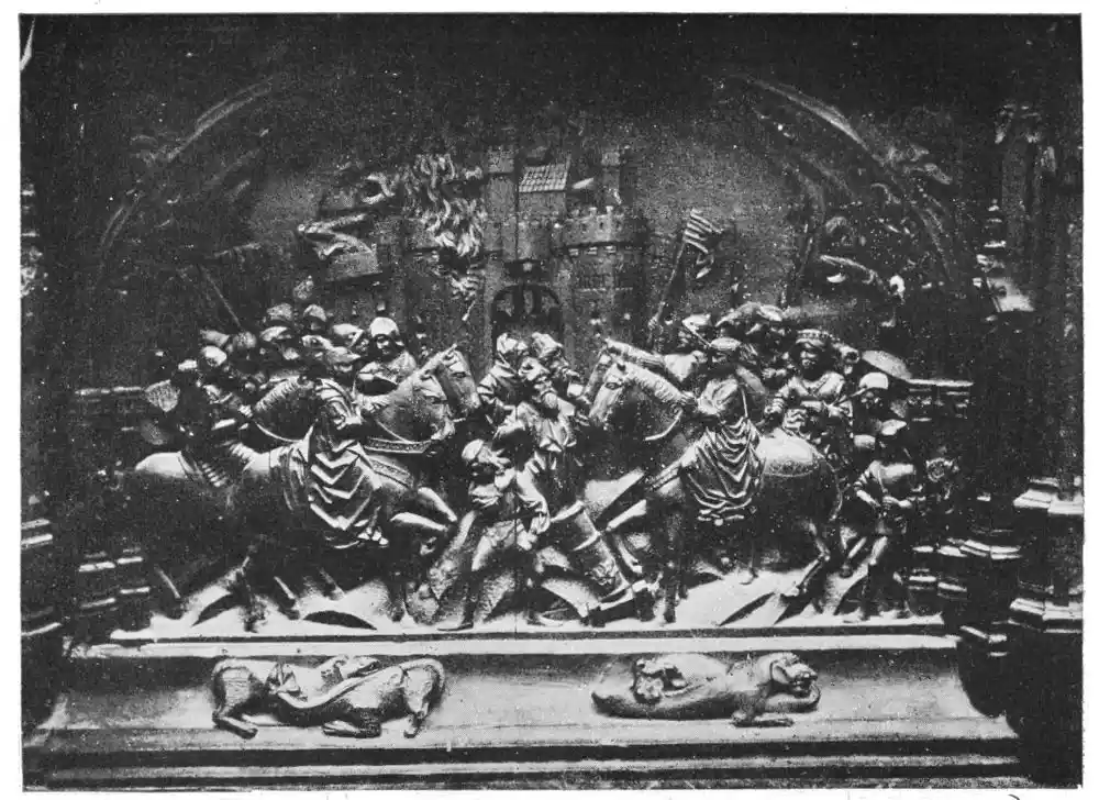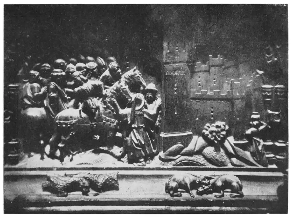 The colourisation of the screen, like most marble and alabaster monuments, has suffered from repeated and careless washings. But the carvings preserve everywhere vestiges of paint and gilt, so that it is possible to reconstruct the scheme of colour. This is curious—generally blue and gold, with only a few touches of red and brown, which M. Marcel Dieulafoy suggests may be due to the artist’s desire to surround St. Tecla by the virginal and holy atmosphere which would be suggested by this manifold and unusual use of blue tones. This realisation of the spiritual expression of a legend is very characteristic of Spain, whose artists possessed as their greatest gift the power of rendering a story just as they felt it had happened.