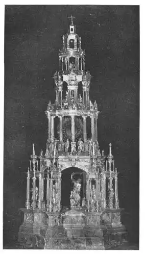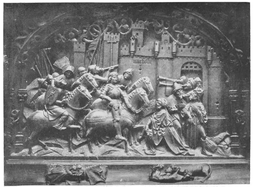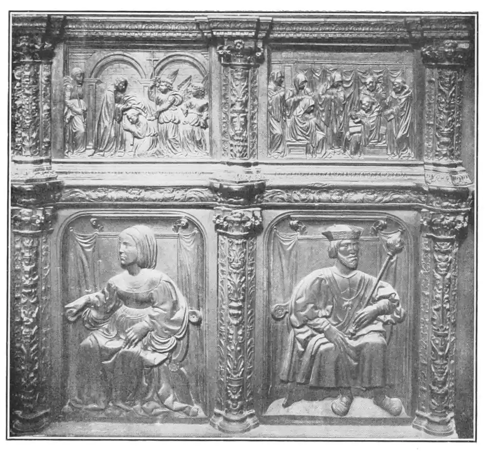 Other statues worthy of special mention are the busts, executed in enamelled silver, of S. Valerius, S. Vincent, and S. Laurent, in the Treasury of Zaragoza Cathedral; the figures of Don Gutierre de Cardenas, Duke of Magueda, and of his wife, Doña Teresa Enriquez, each offering respectively their son and daughter to the Virgin, and the finer praying figure of Juan II. of Castile, who ruled from 1406 to 1454, and was the father of Isabella the Catholic. These statues are in Burgos Cathedral. Gems among smaller works of art are the plates in silver, showing scenes in the life of the Virgin, which cover the high altar in the Cathedral of Gerona. Their date is 1348.{50}