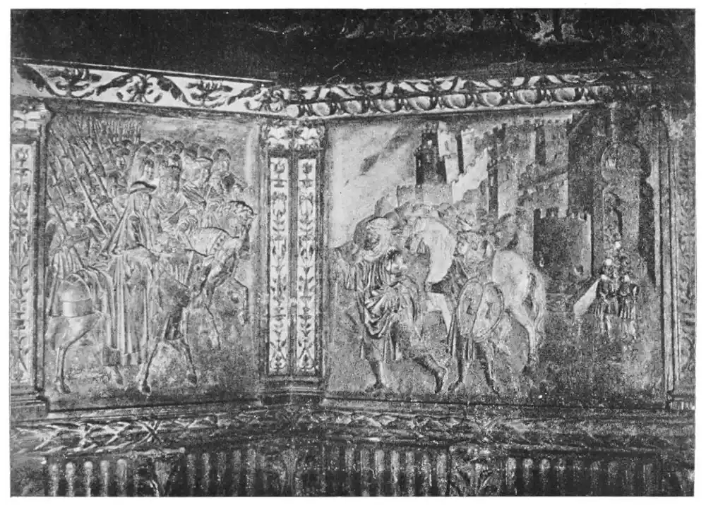 The Colegiata de San Isidoro at Leon (Plate 10), an early Romanesque edifice, resembles in many respects Santiago de Compostella. The actual date of the building is difficult to establish. It was founded by Ferdinand I. of Castile in 1065 as a royal mausoleum; and the building is said to contain the tombs of eleven kings and twelve queens. It was altered and rebuilt by Maestro Pedro Vitambeu, and was not consecrated until 1149, while even then much of its decoration was probably incomplete. Some subjects of sculpture{29} and ornamentation are very analogous to St. Sernin, Toulouse. The main façade is decorated with quaint old reliefs in stone; above the right portal are the Descent from the Cross (Plate 11) and the Deposition in the Tomb, with St. Paul on the right hand and St. Peter on the left. Then in the tympanum of the left portal is a very interesting Sacrifice of Abraham, placed under a zodiacal frieze. But perhaps the most interesting parts of the building are the chapel and cloisters of the eastern aisle, where the groined vaults are covered with fresco paintings of admirable effect and preservation. The paintings show strongly the influence of France, curiously interpreted by the native art. C. Gasquoine Hartley writes, in “A Record of Spanish Painting”: “In colour and certain peculiarities of outline they are strongly French, but they are executed with a rugged and original force which is entirely Spanish.... The Bible narratives are executed with a direct and almost brutal baldness that at once marks the frescoes as the work of a Spaniard.” We are, however, chiefly interested with their colourisation, which is very important where so much of the colourisation of statuary has disappeared. As M. Marcel Dieulafoy points out, these frescoes give the range of tones usual to this epoch in France and in Spain. We{30} find red-brown, indigo, yellow-ochre, and white; the black seems to have been obtained by a mixture of three of these colours. It is interesting to note that these are the colours, and of about the same shade, that we find used by the Persian artists in their decorations.