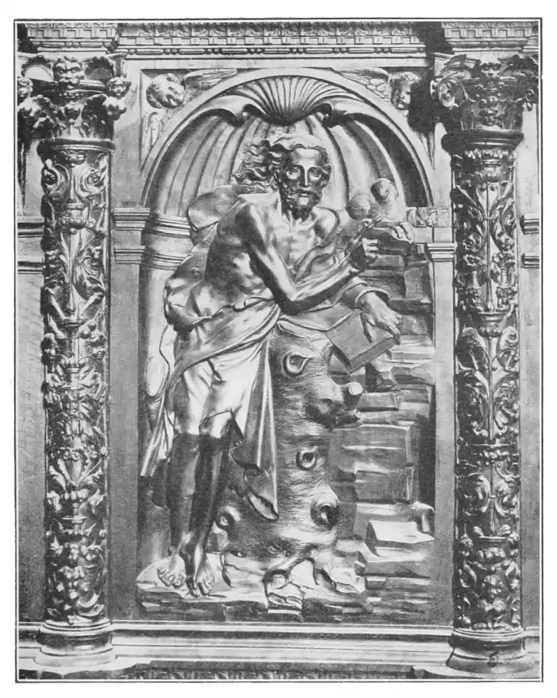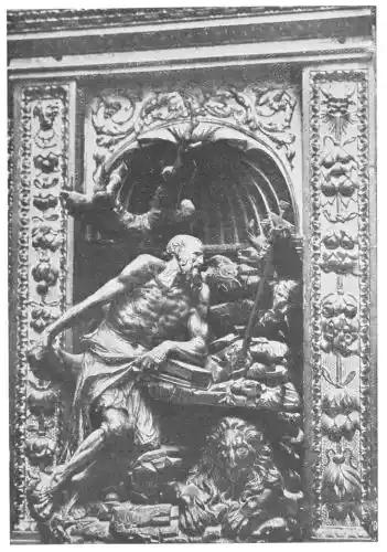The period between 1610 and 1612 was occupied with an important work, the designing and carving of the altar-screen and statues for the old monastery of San Isidoro at Santiponce,{132} in the suburb of Seville. Montañés is noteworthy as a carver of altar-screens, and in this he returned to the methods of earlier artists. Seville owes to him three great retablos; those of Santa Clara and San Lorenzo in the city itself, and the one at Santiponce, which of the three is perhaps the most beautiful. It is in two registers with an attic. In the centre of the first portion stands the magnificent statue of St. Jerome, one of the finest figures of Montañés; placed on the right and left are St. John the Baptist and St. John the Evangelist, and two bas-reliefs of the Adoration of the Magi and of the Shepherds. The last group is especially beautiful. San Isidoro, Archbishop of Seville and patron of the church, occupies the centre of the second register, while the bas-reliefs on either side represent the Resurrection and Ascension of Christ. In the attic are figures of the Cardinal Virtues and an Assumption of the Virgin, which surmount a Crucifix and two kneeling angels.