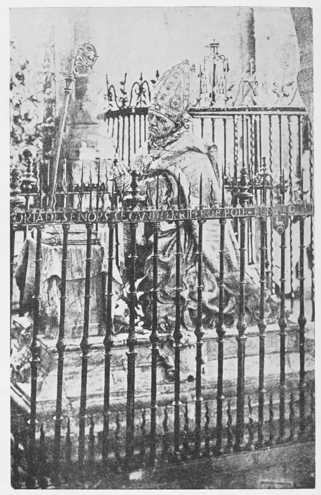 But the most famous of the Italian sculptors of Seville is Pietro Torrigiano, the disciple and rival of Michael Angelo. Torrigiano was born at Florence in the year 1470, and his work early proclaimed him a master. It is recorded that in a fit of rage he broke his rival’s nose with his fist, and as a result of this act of jealousy he had to flee from Italy. For a time he adopted the calling of a soldier, but, angered at not gaining promotion, he again took up his chisel. We hear of him next in England, where he gained fame and wealth by his chapel of Henry VII. in Westminster Abbey. But Torrigiano’s roving disposition again sent him wandering, and he went to Spain, first to Granada, where he competed for the order to execute the tombs of Ferdinand and Isabella, but, being unsuccessful, he came to Seville, in which city he finally settled. He died in 1522 in a dungeon of the Inquisition, which Vasari says was due to his smashing in a fit of rage a statue of the Virgin, ordered by the Duke of Arcos, because he considered the payment insufficient. But Cean Bermudez, though he does not deny the story, states that Torrigiano was charged with heresy.