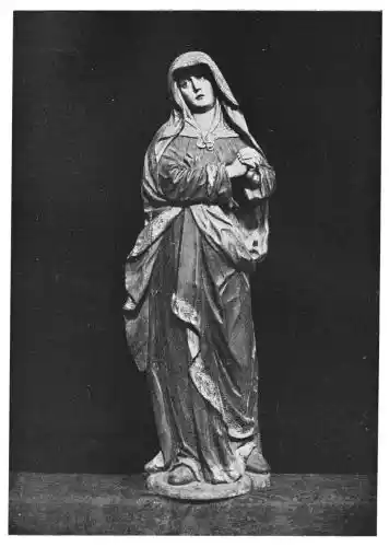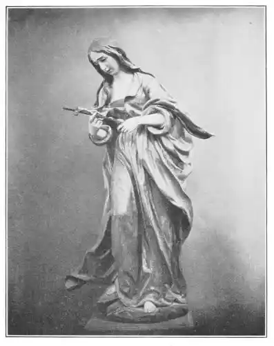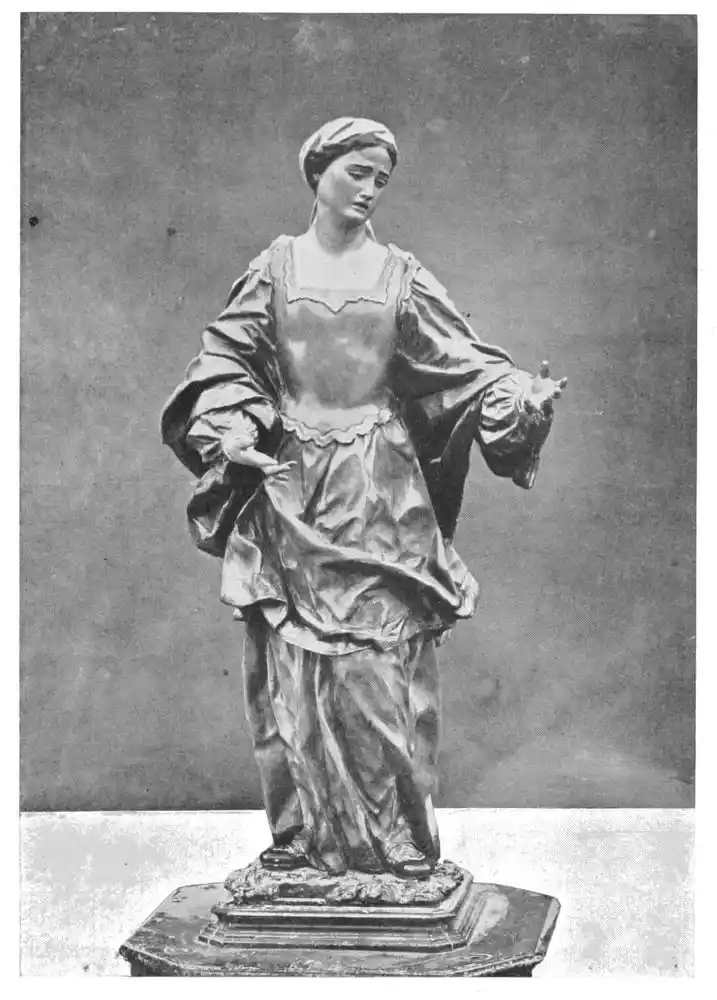 To Hernandez also is attributed the reliquary bust of St. Elizabeth in the museum. It is a work of supreme merit, but the polychrome is too brilliant to make it easy to accept it as the work of Hernandez. The vivid orange-brown of the cape with the blue lining, the violet-purple of the turban, the gleaming white of the veil, and the gold tracery of the breast ornament are not the accustomed tones of the Galician master. But though the statue is probably not by Hernandez—and this is the opinion of M. Marcel Dieulafoy—it is a splendid example of polychrome.