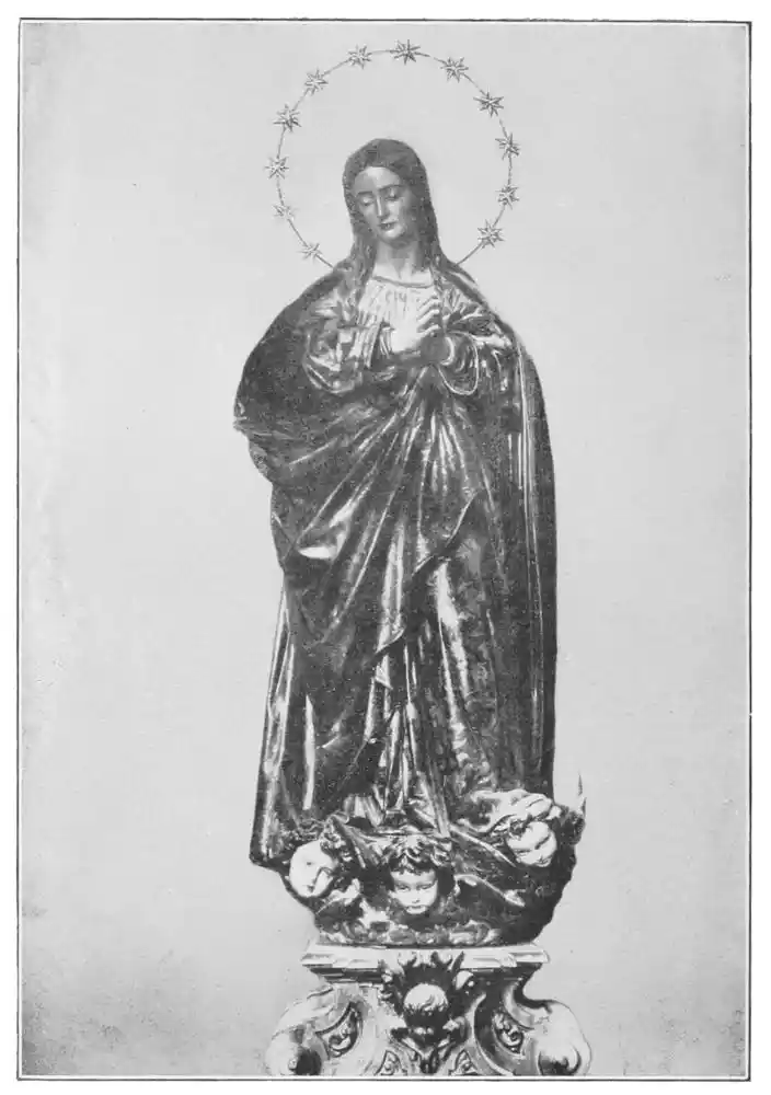 The last years of the seventeenth century saw the death of the great sculptors of Spain, and with the opening of the eighteenth century we may say that the art of sculpture itself was dead. A corruption in taste had become general; it was evident in painting and in architecture as well as in sculpture. Churriguera was the great offender, but his contemporaries, following his lead, had sought by bad taste, displayed in excessive decoration and vivid colour, “to correct” the simplicity of art. The decline of sculpture in the South was more rapid and perhaps greater than{171} in the Northern schools. Many of the old altar-screens were replaced by modern works of the new false art. A popular desire arose for works of the coarsest materialisation. The custom grew of dressing the statues in real garments. Then eyes of glass and real hair were in many instances added, and apparatus was invented for moving the head, mouth, eyes, and limbs of the statues. Many pieces of fine sculpture were actually destroyed to meet this degraded demand. The Virgins, and notably the las Doloras, were subjected to this treatment. One example of these “dressed images” is a Virgin in Seville Cathedral. The limbs of this carved doll move at the joints, while a contrivance in the body enables the head to turn to the right or the left. The body is covered with rose-coloured taffeta which is glued to the wood, the hair is of silk plaited with gold threads, and shoes of white kid encase the feet. Sometimes the figure sits, and sometimes stands, and the Child Jesus is placed in the arms or upon the knees according to the position of the mother.