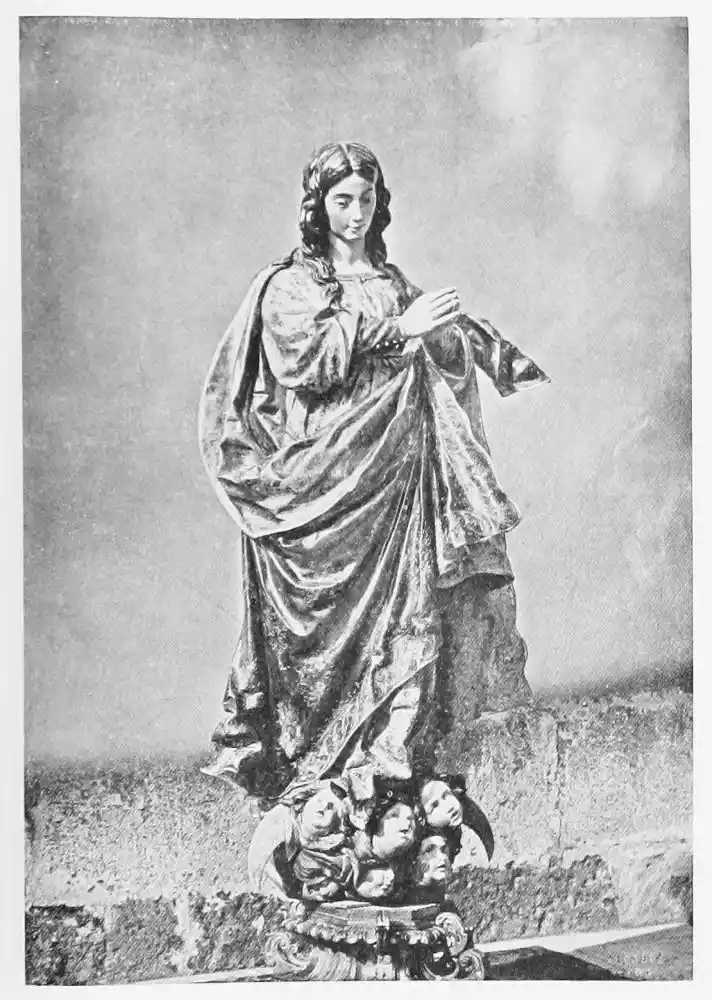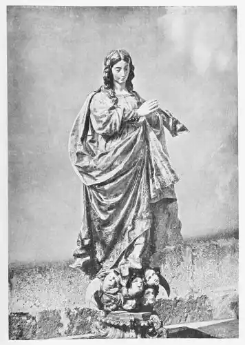 As well as interpreting the story of Christ’s Passion, Montañés created statues of the Virgin, whose dignity, beauty, and feeling won for him the popular admiration of his contemporaries. The worship of the Mother of God had always made deep appeal to the religious heart of Spain; then, in the year 1617, a papal edict was issued, at the earnest instigation of Philip IV., declaring the immaculate nature of Mary. No dogma had ever been accepted so readily, or believed in so fervently, in Spain. The worship of the people in Montañés’ life was, in point of fact, practically centred in adoration of the Virgin{136} Mary; the many different religious orders, while venerating their respective founders and saints, were all united in their devotion to the Virgin. Art, still the servant of religion, was summoned to give expression to this passionate worship. Every artist was engaged in depicting the Virgin Mother. In the North, the artists, working under the inspiration of the Flemish masters, had delighted in representing those Virgins of Anguish where the Mother mourns at the foot of the Cross for her Son. But now Mary took a new form; she symbolises grace and beauty instead of the severity and asceticism of the older ideal. This was especially the case in Seville, the joyous city of the South. Here in exquisite images and paintings we see her young and happy, the sinless Virgin-Mother of the Lord. Montañés in sculpture and Murillo in painting were the great masters of this new ideal. They interpreted the favoured subject with that combination of naturalism and mysticism which found its way direct to the heart of the Andalusian religionists. They share together the claim of being the creators of the Spanish Virgins.