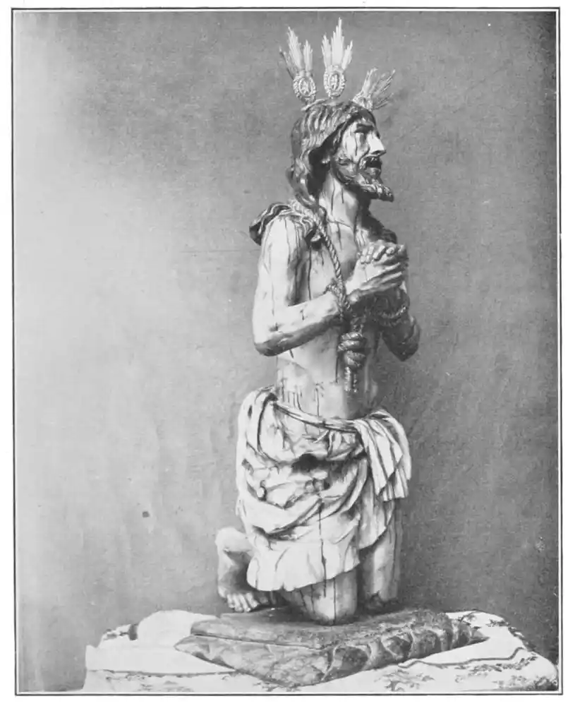 A third artist who worked at this period, and a carver of more personal talent, was Capitan Cepeda, a native of Cordova, who, like Torrigiano was in turn a soldier and artist. He served in Italy and afterwards came to Seville, being summoned there by the goldsmiths of the city for the special work of arousing a devotion for the Crucified Christ. With this object Cepeda modelled the Cristo de la Expiracion which now stands on the altar of the small chapel of the museum. It is a work of Spanish realism, finely executed, with every detail of sorrow expressed and accentuated by the violent attitude and gesture. Again we would emphasise the fact that such a work can only be estimated truly by remembering the Spanish religious spirit. Cepeda represents in Seville the style which Juan Juni made popular in the Northern schools. Like that artist, his interest rests in the individuality of his work, which is national and wholly Spanish, while his contemporaries, Jerónimo Hernandez and Gaspar Nicolas Delgado, followed the newer influences from Italy.