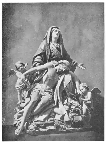 Roldana’s best work is the Virgin, known as Nuestra Señora de las Augustias, which is at Cadiz (Plate 153), where it is greatly esteemed. This praise is deserved. The group is cleverly composed, and is remarkable for the originality displayed in the placing of the figures; the body of the dead Christ rests between the knees of the Virgin instead of across them. The Christ is excellent, the Virgin is less good; but the angels who hold up the arms of the Divine Sufferer are very beautiful. The way in which they are grouped is masterly. The Escorial has one work by Roldana, a statue of St. Michael, who is shown dancing, and is dressed in the armour and Roman costume of the century of Louis XIV. This statue is less noteworthy.{150}
