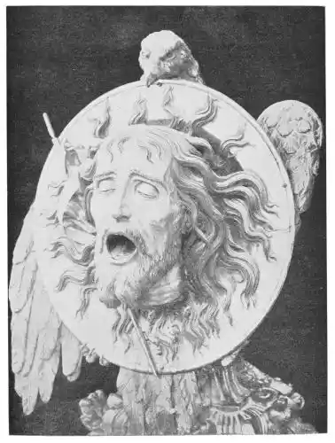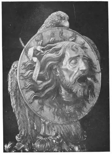 Other carvings in the cathedral that are ascribed to Cano, though his authorship in some of the pieces is disputed, are the colossal busts of Adam and Eve placed very high to the right and left of the entrance to the Capilla Mayor, and the heads of St. Paul and St. John the Baptist, which are hidden in the darkness of the Chapel of Nuestra Señora del Carmel. These carvings, and especially the bleeding heads of the saints, are subjects that do not properly belong to Cano’s art, but were undertaken by him to meet the popular taste of his{160} day, and for this reason they are of less interest. Yet their importance is great on account of the excellence of the polychrome. The Adam and Eve, larger than life-size, are carved in oak, and harmoniously coloured with excellent care. Unfortunately the height at which they are placed makes it very difficult to see them. The head of St. Paul and that of the Baptist—if this is Cano’s work, and the skill of the craftsmanship points to its being so—must be classed with the similar head of St. John the Baptist in the Church of Santa Paula, which is also ascribed to Cano. This last piece seems to have been copied from the head of the Prophet sculptured by Montañés for the Church of Santa Clara. There is also a most excellent Head of St. John the Baptist in the Camarin of the Chapel of San Juan de Dios, which must certainly be Cano’s work (Plates 154-156). None but a master could have carved this head; it is the finest example in Spain of a polychrome of this subject. The livid face, which shows the death-marks, is surrounded with tumbled locks of black hair and a beard of the same colour. Both it and the bleeding neck are faithfully and splendidly rendered: there is beauty in the horror. The charger on which the head is placed is of gold, and{161} forms a sort of aureole around it. At the top an eagle has seized it in its beak to carry the relic to heaven; the bird is painted a deep warm black with beautiful reflections.
