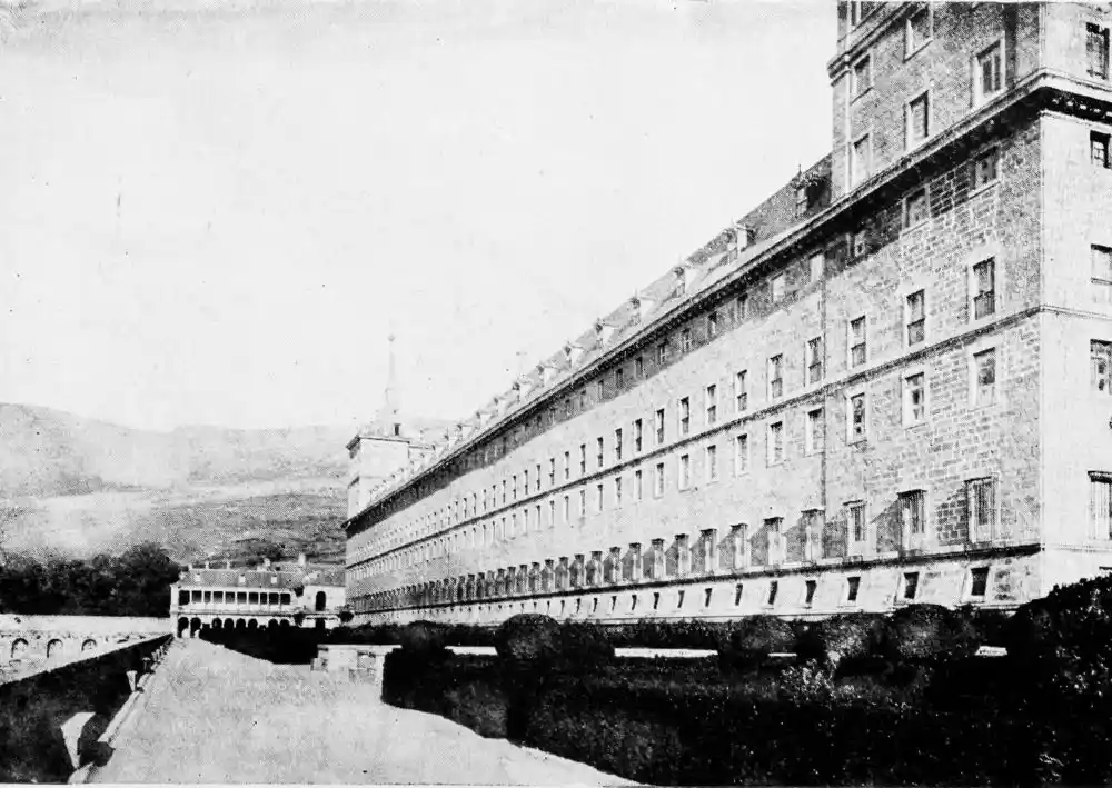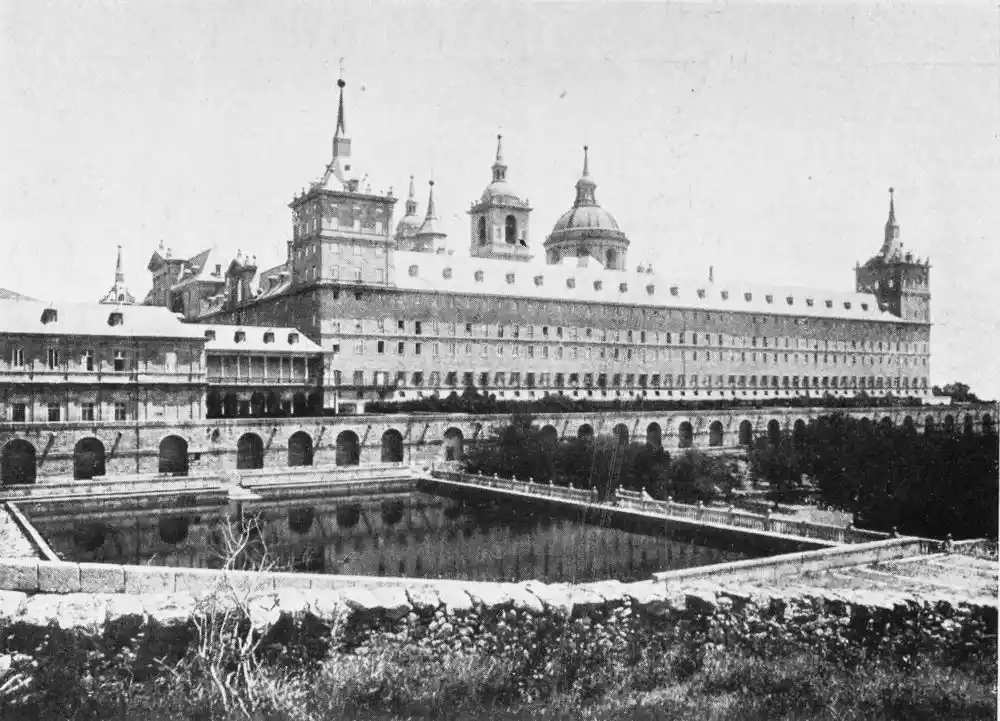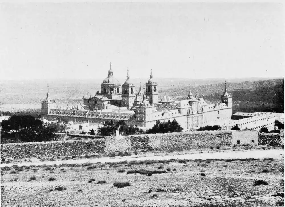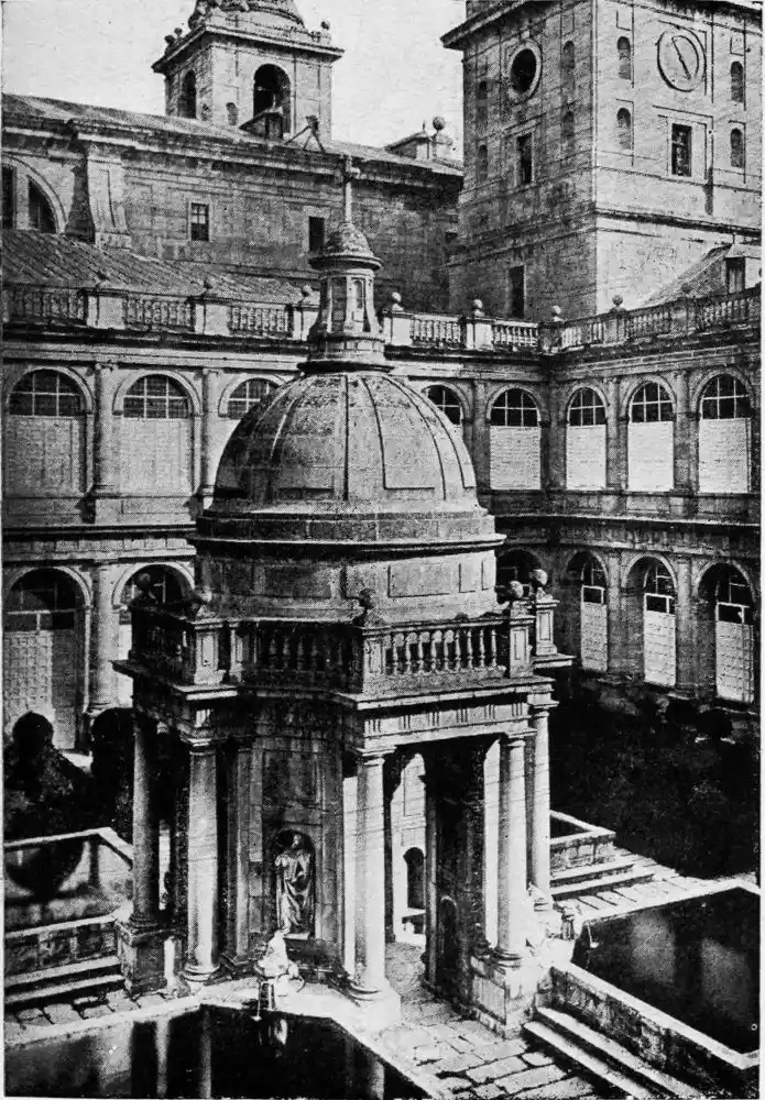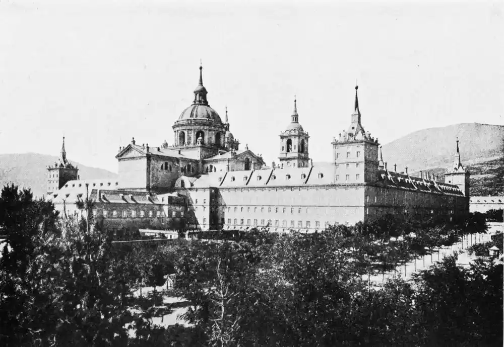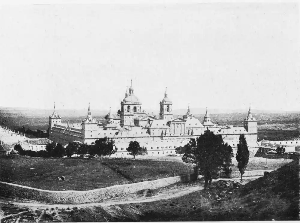 Buildings, like poems or pictures, reflect the character of those who conceive and produce them. The Escorial may be likened to a document or a painting revealing the temperament, the aspirations, and the philosophy of a powerful, sombre, and withal, fascinating personality. Its severe form and its restrained embellishment are stamped with the individuality of the monarch who devoted the leisure of thirty years of his life to the erection, extension, improvement, and internal adornment of an immense and costly pile, comprising within its walls a monastery, a church, a burial-fane, a palace, a college, and a gallery of the arts. The Escorial was a place of retirement, an imposing hermitage for the devout and moody Philip II. of Spain. It is a monument{2} to his power, a revelation of his mind; and, if we study the edifice, we shall learn what manner of man he was who founded it.