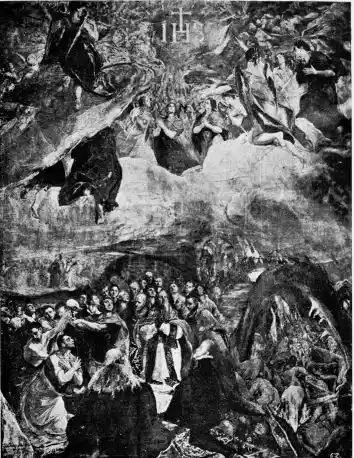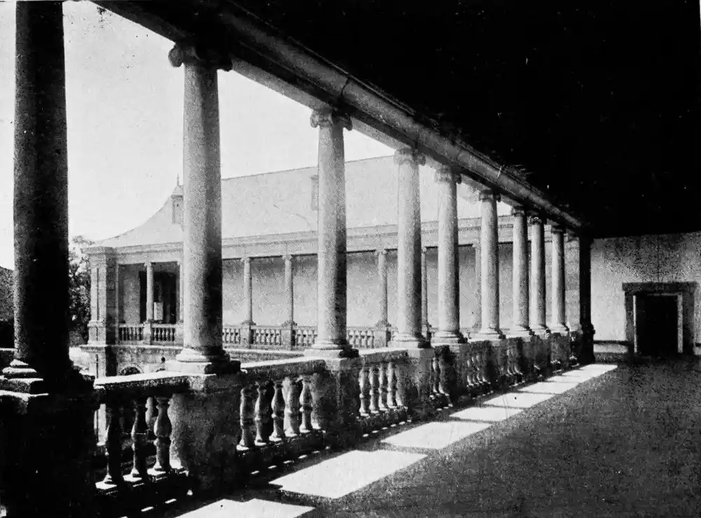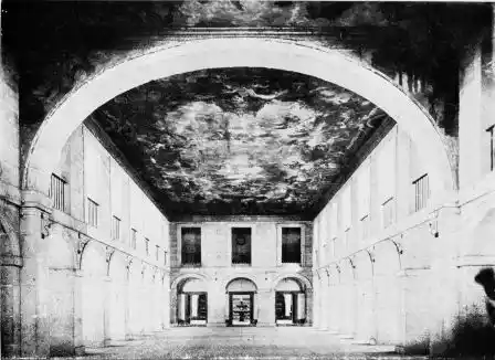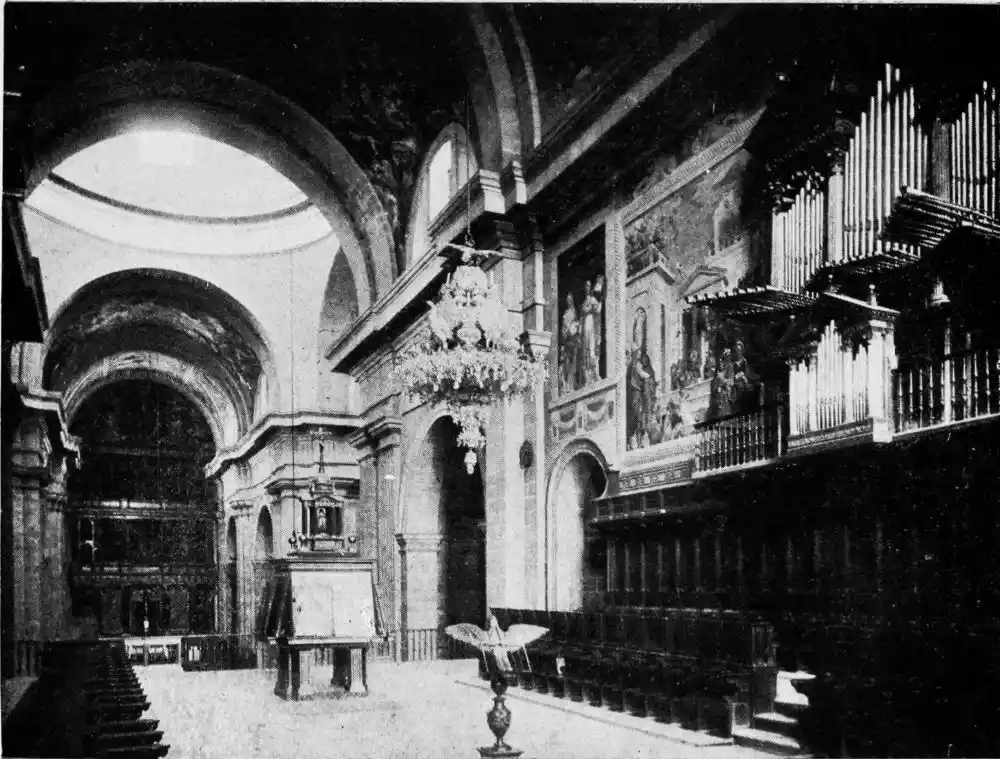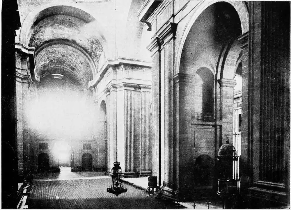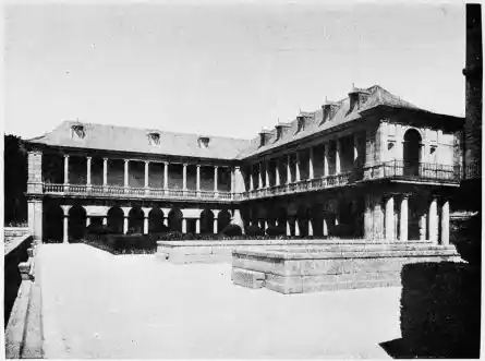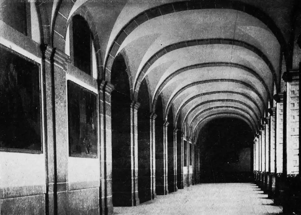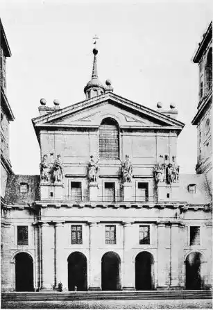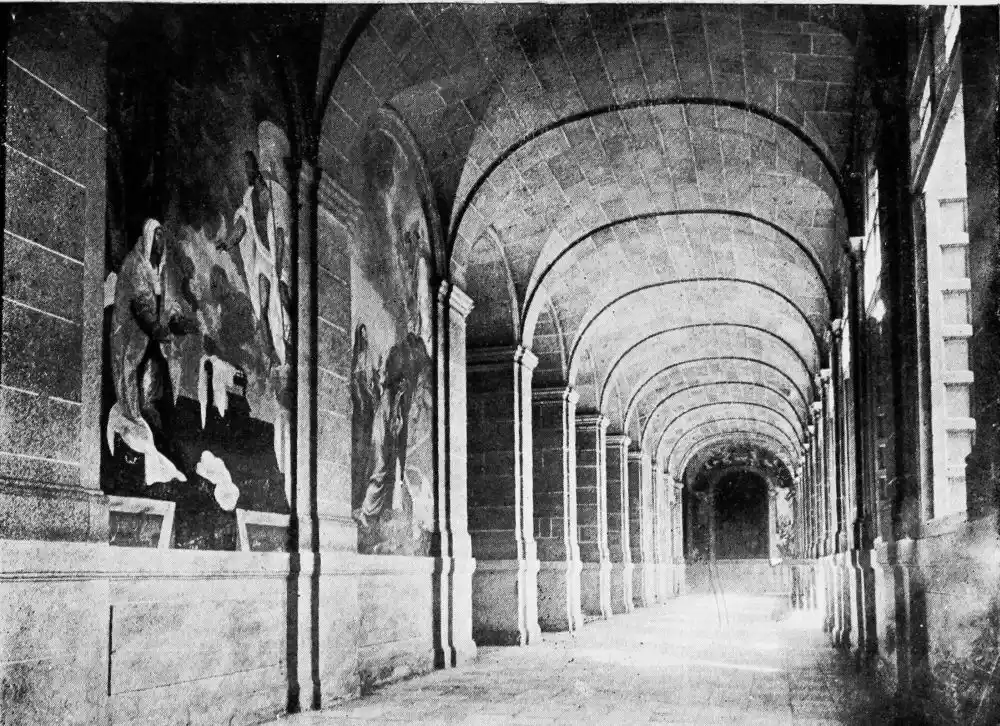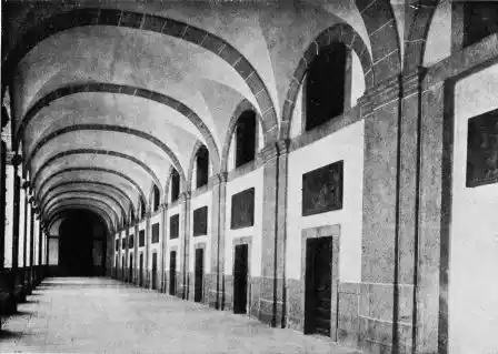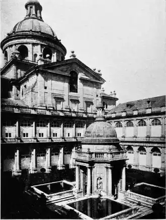 Toledo’s plan was ambitious and eccentric. He was influenced by the Renaissance ideals, and he employed the Doric style in its severest examples. Philip would have no luxurious decorations, no flamboyant effects; everything{11} must be plain to austerity. Some critics have asserted that the simplicity of the Escorial is impressive and noble, while others complain of its rigidity and sombreness. The plan of the building is in the shape of a gridiron, to commemorate, it is surmised, the fate of San Lorenzo, who was roasted on a grid. The handle of the gridiron is represented by the Palace of the Infantas; the monastery, the seminary, and the royal apartments represent the bars of the implement upon which the saint was martyred.