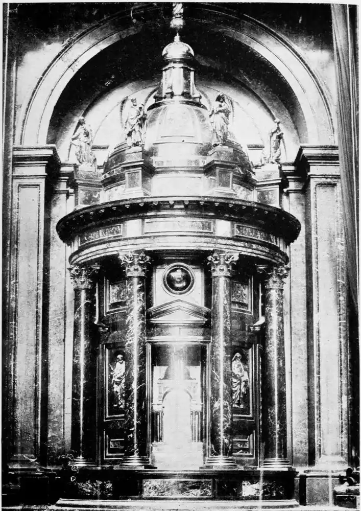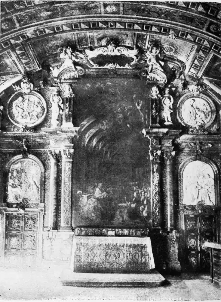 In 1586 the king was busy with preparations for the ceremony of consecrating the church of the Escorial, which had been completed some time previously. During the erection of the church, services were held in a temporary structure, and in this building there was a celebration of the mass before the procession{15} entered the new church. Philip, the prince, and several great clerics supported the canopy which was carried in the solemn pageant. The temporary church, which stood in the hamlet, was afterwards reconstructed, and placed at the service of the people.