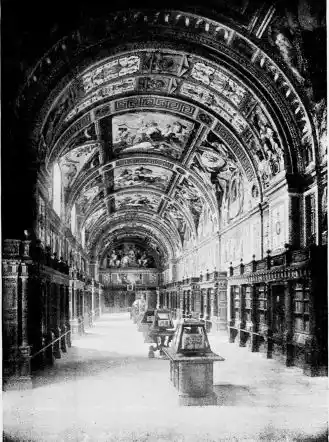 The Escorial reflects the genius of Spain at the period following upon the final emancipation from the sway of the Moors. It is an image, as it were, of the powerful monarch who founded it, and spent so many years of his life in superintending the construction and decoration of the building. The Real Monasterio de San Lorenzo del Escorial is a repository of many of the world’s masterpieces of art, a library of rare and costly manuscripts and volumes, a sumptuous hermitage, a college, and a sanctuary. It is one of the{viii} wonders of Spain, and among the most historically interesting royal residences in Europe. With the aid of the letterpress and the illustrations included here, those readers who have not visited the Escorial will, I trust, be enabled to realise something of its massive grandeur, and to appreciate its significance in the history of the Spanish nation; while those who propose to inspect this ‘Leviathan of Architecture’ will find these pages useful in directing their attention to the chief works of art and objects of interest.