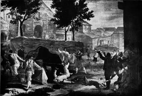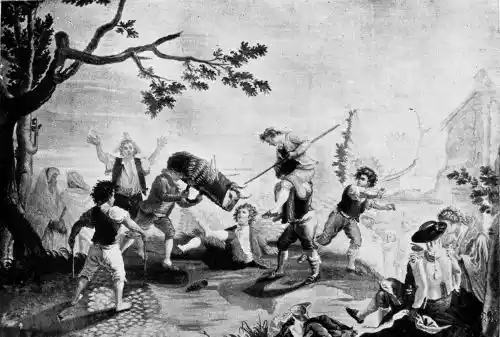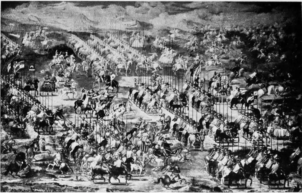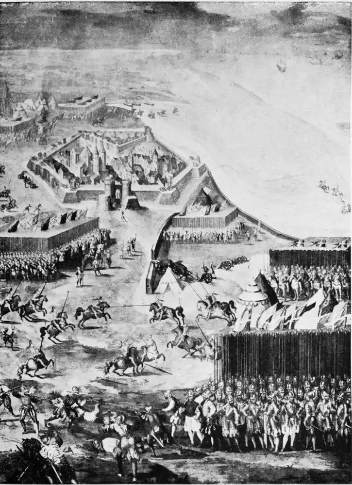 Tragedy attended the wedding festivities of Philip and Elizabeth of France. In the course of a tournament, arranged by Henry, father of the princess, a challenge was sent by that monarch to Lord Montgomery, a Scottish nobleman and captain of the king’s guard, renowned for his feats of arms. The queen begged the king to refrain from the encounter, but Henry commanded the unwilling Montgomery to prepare for the combat. At the first encounter the Scot pierced the visor of his opponent; the lance splintered, and a piece of it penetrated the eye of the king, who was borne from the arena by his attendants seriously wounded and unconscious.{6} For ten days he lay in pain, and died on July 10, 1559, of his injury. His queen, Catherine de Medici, thus saw the fulfilment of her foreboding when she vainly besought the valorous Henry to abstain from further jousting.