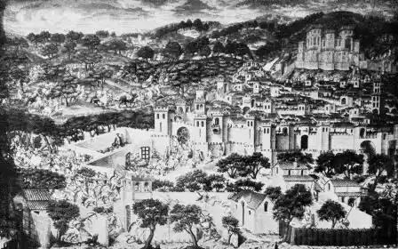 The first stone was laid on April 23, 1563. Toledo worked upon the Escorial till 1567, when he died. His scheme embraced the monastery for fifty Hieronymite monks, the royal residence, the burial-chamber, and the church. Juan Bautista de Toledo was succeeded by Juan de Herrera, who enlarged the convent and designed a bell tower. His assistant was Juan de Minjores, who had executed the church of the Alhambra, and planned part of the Alcazar of Seville.