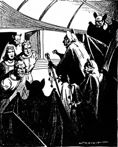 And then, in a split-second, the decision became no longer his to make. For as if the victory of the first two bat-men had determined the action of the entire clan, out of the bronze gateway flooded a veritable host of the sickening winged creatures!