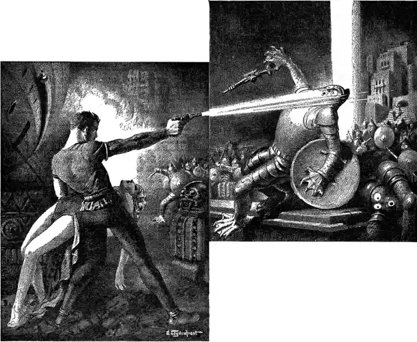 Once more the fangs gaped at his throat. Vanning summoned his waning strength. His left hand gripped the monster's lower jaw, his right hand the upper. Sharp teeth ripped his fingers. He did not feel them, nor the foul, gusting breath that blew hot on his sweating face.