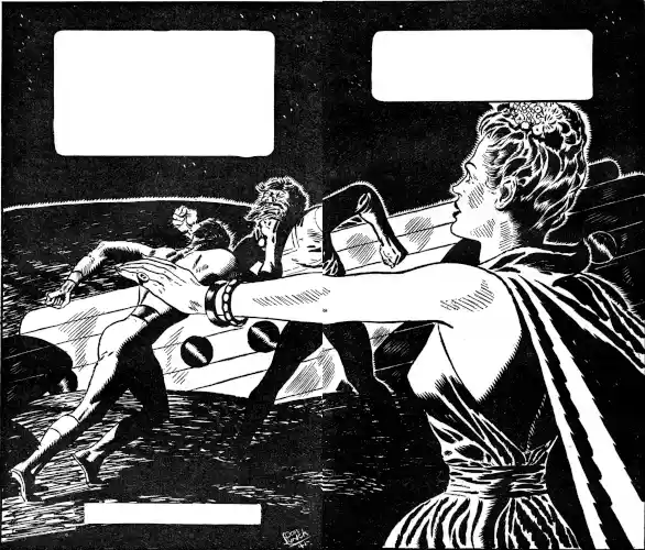 "She has a habit of locking the controls," explained Haldane, "and setting ravaged ships adrift. Apparently there is no room on her hideout—wherever it is—for empty hulks. One of these ships was salvaged by a courageous cabin-boy who hid from the Lorelei and her pirate band beneath a closetful of soiled linens in the laundry. He described her. His description goes perfectly with less accurate glimpses seen over the visiphones of several score spacecraft!"