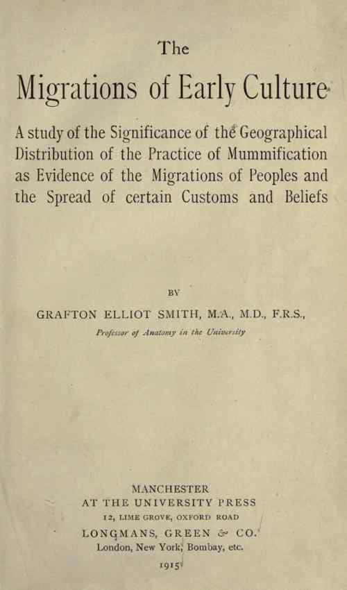 “After dealing with the evidence from the resemblances in the physical characteristics of widely separated populations—such, for instance, as certain of the ancient inhabitants of Western Asia on the one hand, and certain Polynesians on the other—suggesting far-reaching prehistoric migrations, the distribution of certain peculiarly distinctive practices, such as mummification and the building of megalithic monuments, is made use of to confirm the reality of such wanderings of peoples.