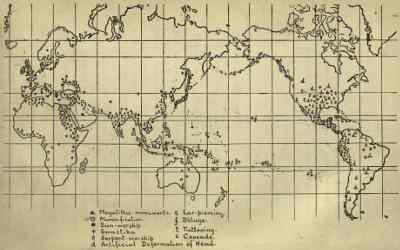 If a map of the world is taken and one plots out (Map I.) the geographical distribution of such remarkable customs as the building of megalithic monuments (see for example Lane Fox’s [Pitt Rivers’] map, 20), the worship of the sun and the serpent (51; 103), the custom of piercing the ears (see Park Harrison, 29), tattooing (see Miss Buckland, 10), the practice of circumcision, the curious custom known as couvade, the practice of massage, the complex story of the creation, the deluge, the petrifaction of human beings, the divine origin of kings and a chosen people sprung from an incestuous union (W. J. Perry), the use of the swastika-symbol (see Wilson’s map, 105), the practice of cranial deformation, to mention only a few of the many that might be enumerated, it will be found that in most respects the areas in which this extraordinary assortment of bizarre customs and beliefs is found coincide one with the other. In some of the series gaps occur, which probably are more often due to lack of information on our part than to real absence of the practice; in other places one or other of the elements of this complex culture-mixture has overflowed the common channel and broken into new territory. But considered in conjunction these data enable us definitely and precisely to map out the route taken by this peculiarly distinctive group of eccentricities of the human mind. If each of them is considered alone there are many breaks in the chain and many uncertainties as to the precise course: but when taken together all of these gaps are bridged. Moreover, in most areas there are traditions of culture-heroes, who brought in some or all of these customs at one and the same time and also introduced a knowledge of agriculture and weaving.