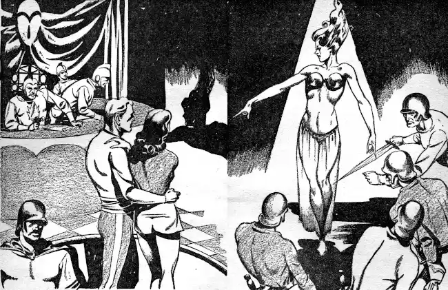And this time she was triumphant. Her scorn hit the Overlord in his one most vulnerable spot ... his colossal vanity. His dark eyes flamed with petulance. He snarled, "Oh, let be! No man shall say the Overlord retracted a pledge. If you must have this man—" He turned to Morris—"Well, what say you, rebel? Are you too proud to buy your life at the expense of rebellion? Or will you accept life at the price of a new existence of loyalty ... to me?"