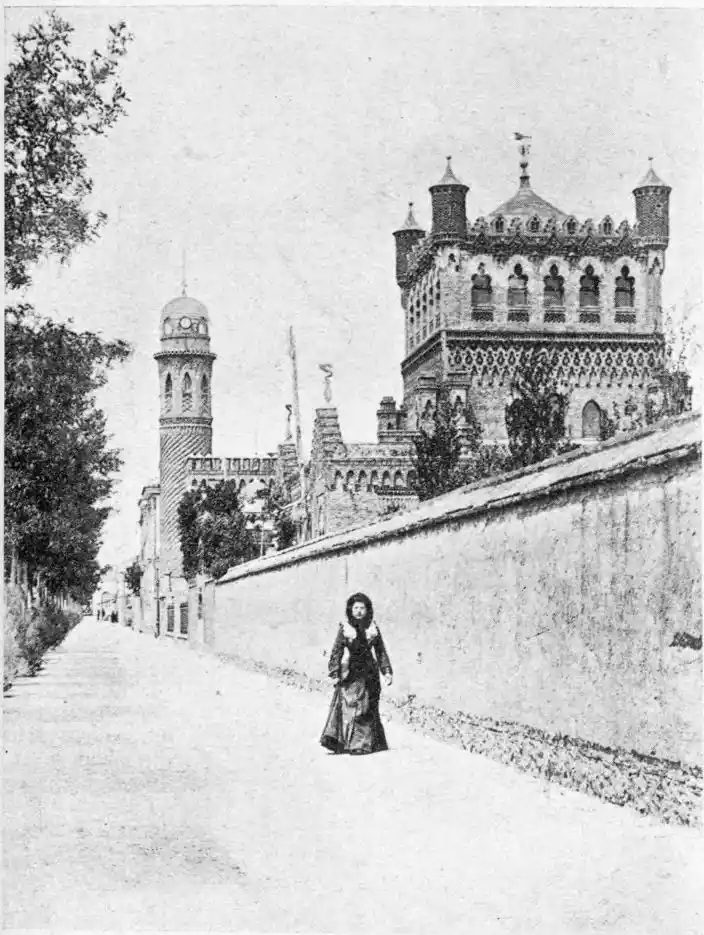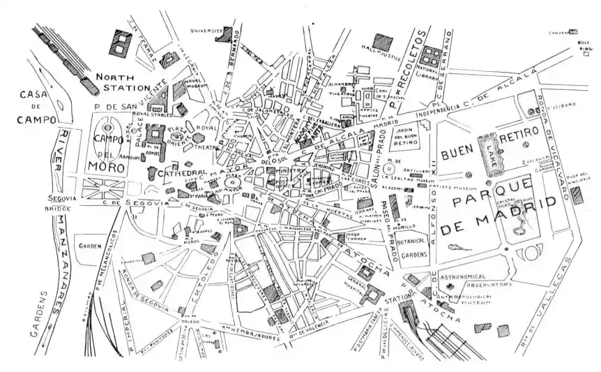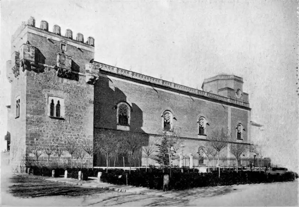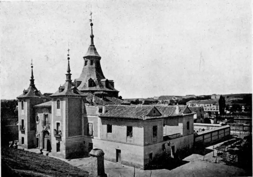 Upon the disruption of the Khalifate the town became subject to Toledo. Whether it was reconquered before or after the fall of that city, by Alfonso VI., is a vexed question. The credit of taking the town is assumed by the people of Segovia. At this time (1085) Madrid was encompassed by a strong wall, stretching from the Moorish Alcázar, now the Royal Palace, to the Church of our Lady of the Almudena; thence to the street of Segovia by the Cuesta de los Ciegos to the Puerta de Moros, and through the{19} Calle Mayor and the Plaza de Oriente to the Alcázar.