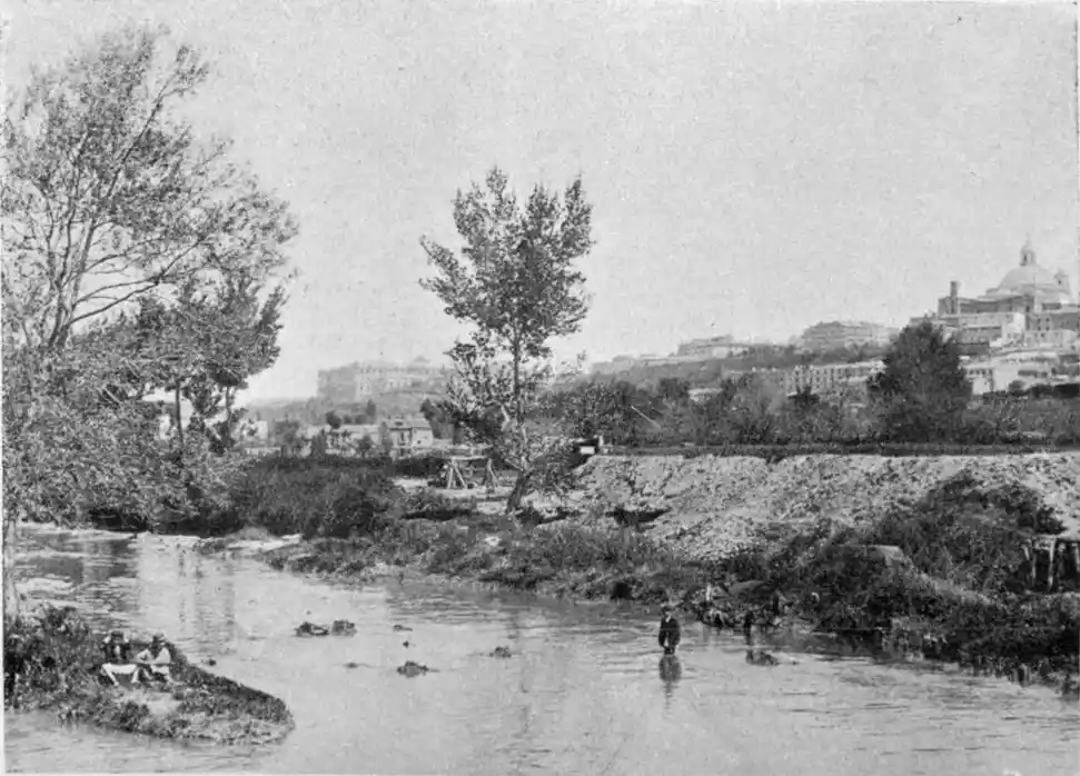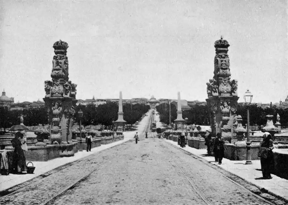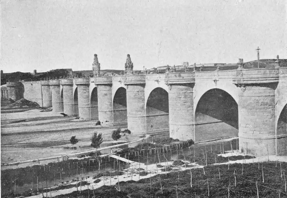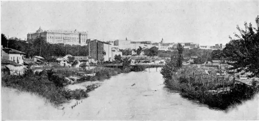 Madrid lacks the dignity and beauty which a wide river lends to a city. The little Manzanares is not an imposing flood. It can scarcely rank as a river. The handsome Puente de Toledo spans the stream, and gives a touch of the picturesque to its muddy flow; and there is also the well-constructed Bridge of Segovia, with many arches. These gave rise to the now venerable joke that it would be better to sell the bridges and buy some water with the proceeds.