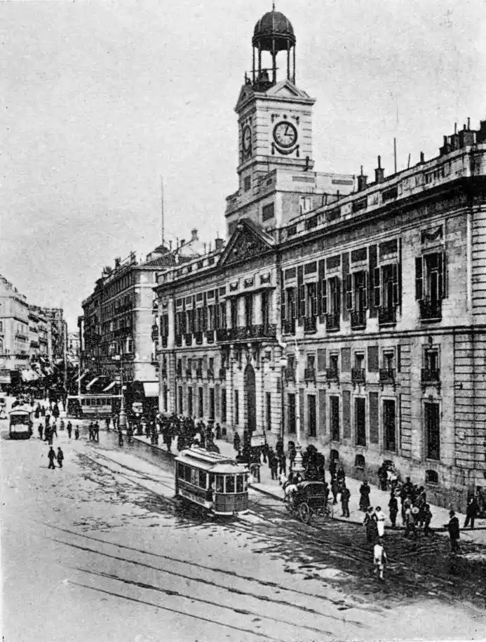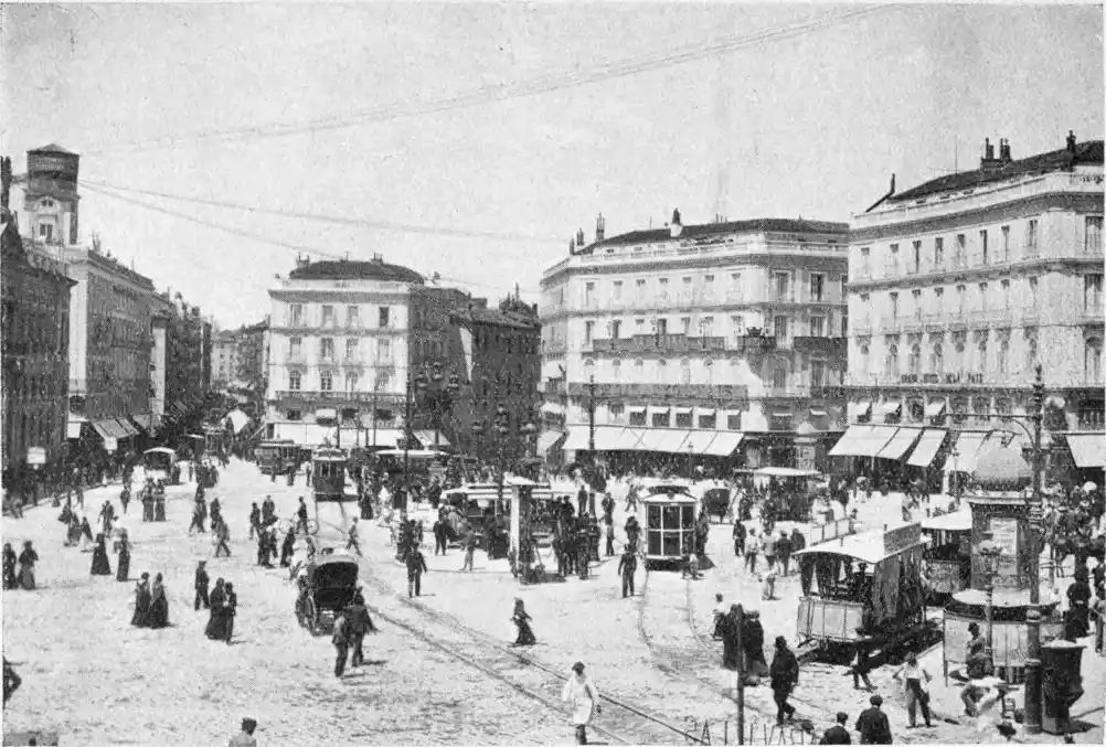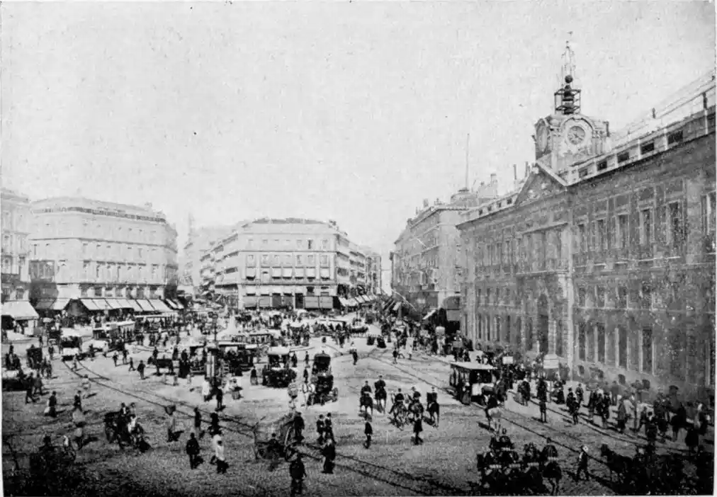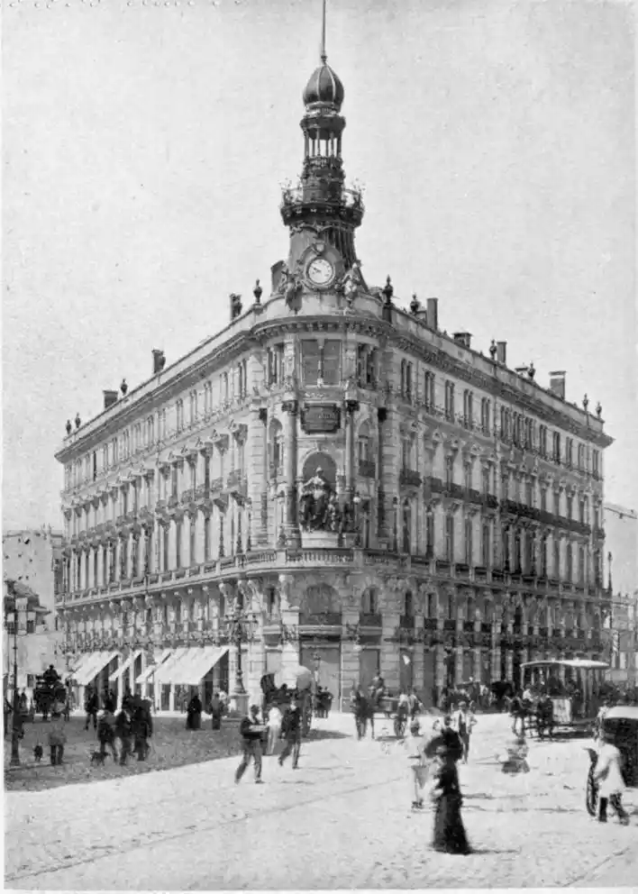 From the Puerta del Sol the chief thoroughfares of Madrid radiate. The Calle de Alcalá, the Calle del Arenal, the Calle Mayor, and the fashionable Carrera de San Jerónimo branch from this central square. In the Puerta del Sol stands the Ministerio de la Gobernación, a large, but not architecturally notable, edifice. Here also are the chief hotels, cafés, and restaurants. In the Calle de San Jerónimo are the best shops. Every one comes to stroll, lounge, and “to take the sun” in this bright, busy space in the heart of the city. It is the Piccadilly Circus of Madrid. All the types of Madrid’s population may be seen here from the bull-fighter to the great legislator. American and English tourists mingle with the throng; German commercial travellers talk business to their customers on the{10} seats outside the cafés; and one hears several languages spoken in the hotels.