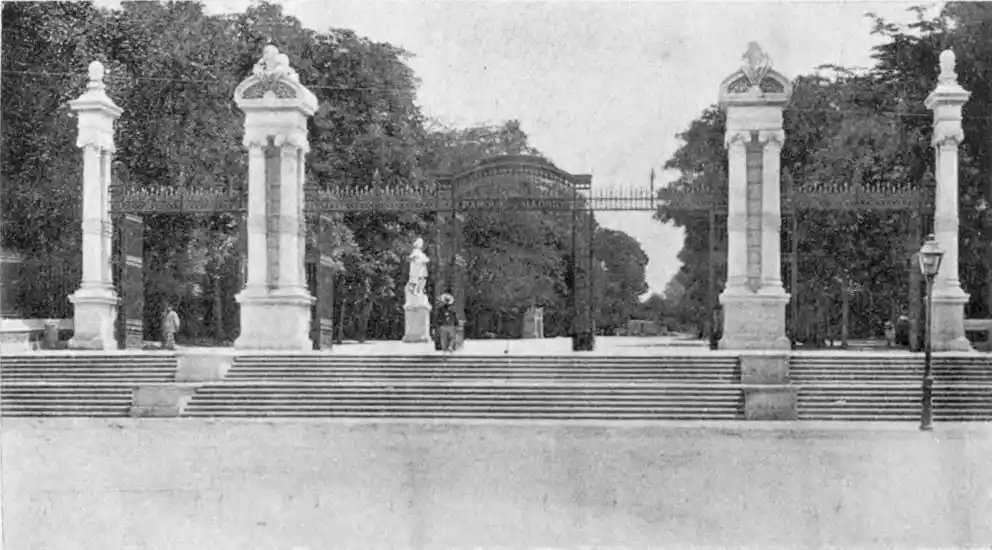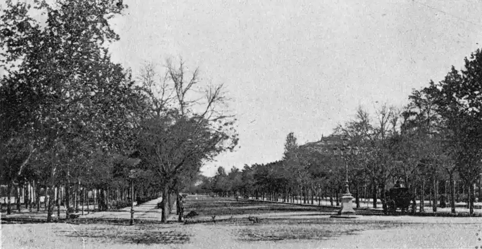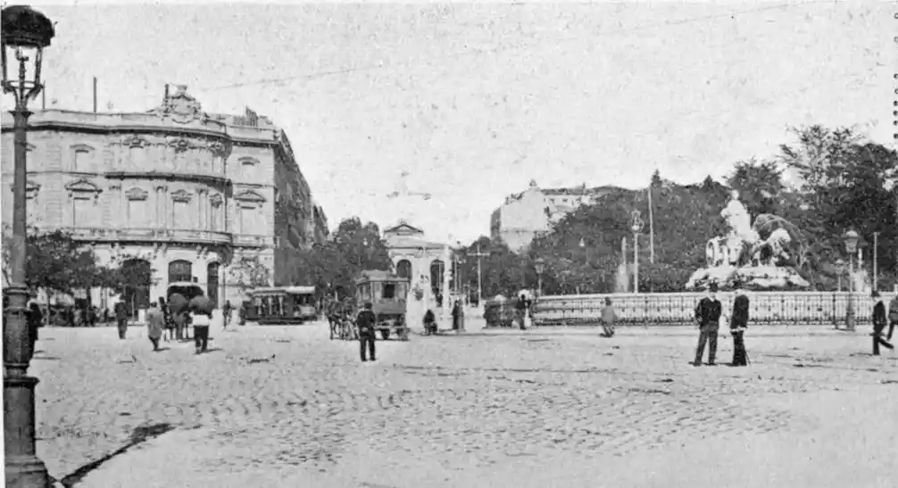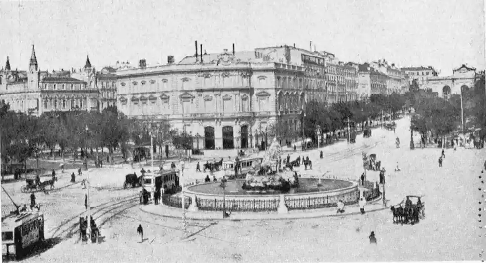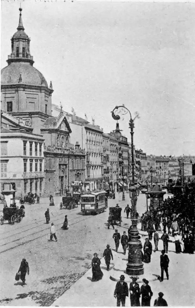 To say that Madrid is an attempted replica of Paris is scarcely a fair description of the city. Madrid has an aspect and a character of its own. Its gaieties are tempered with Castilian restraint. The business of the city is conducted without bustle; the diversions are matters of importance, and they are keenly enjoyed; but the Madrileño is not so vivacious and hilarious as the Parisian. Even here, in the hub of modern Spain, the Spaniard exhibits his placidity and patience. He is not given to hurry. The express train, which travels at a speed of twenty-five miles an hour, is fast enough for him, and he will get up in the early morning to catch it. Yet life in Madrid is{7} decidedly animated, even if it is the pursuit of pleasure and not of wealth that occupies its inhabitants.