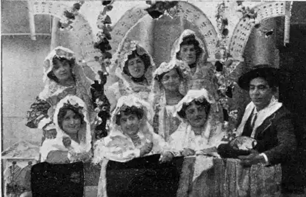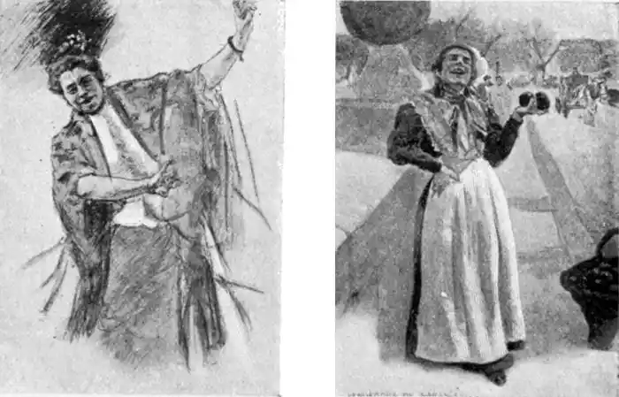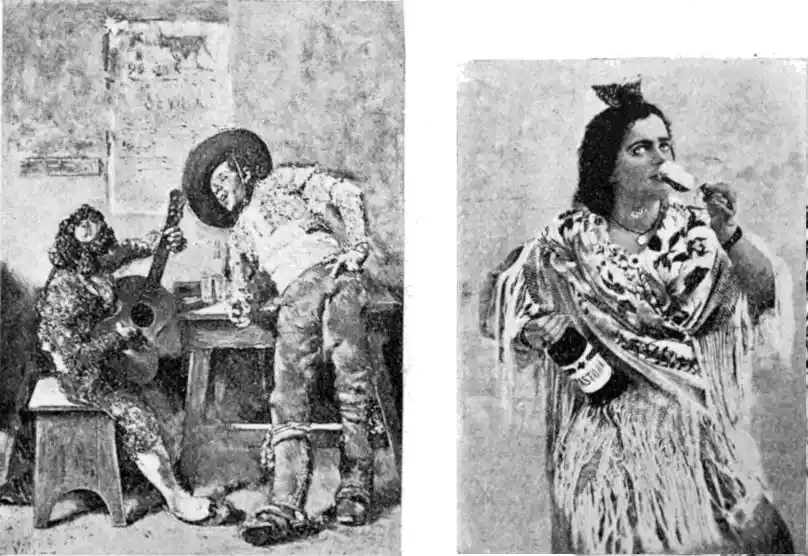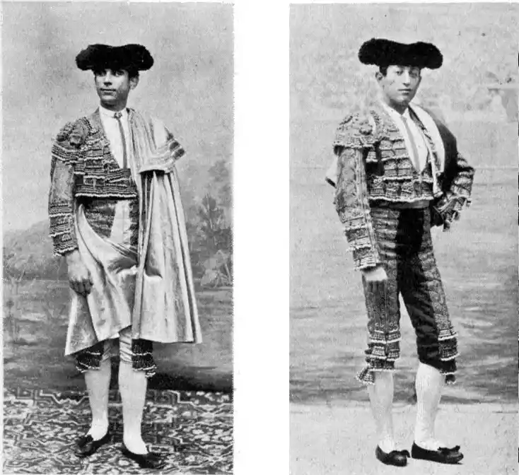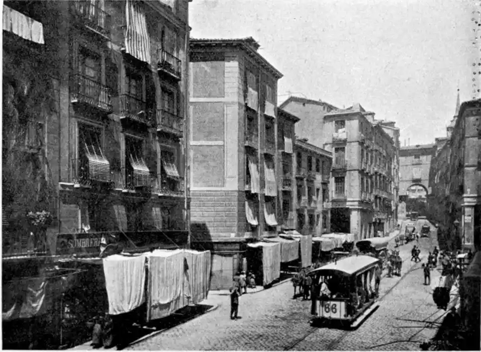 No, despite the tramcars, the modern air of the streets, and the London and Parisian fashions in dress, you cannot fail to realise that this is a Spanish city. Look at the workman, in his canvas blouse and drill trousers, with the boina on his head and hemp-soled canvas shoes upon his feet; or the work-girl, with a rose in her hair and a fan in{8} her hand. These are types of Spain, distinctive in their social ideals, their garb, and their physiognomy. Now and then, a peasant from the provinces is seen rubbing shoulders with a grandee, clad in the costume of Piccadilly. The contrast is sharp; the man about town and the field-toiler might be natives of two different countries, for the wear of the peasant is more African than European. His feet are in sandals, his legs bound with linen, his head tied up in a kerchief, and his body clothed with white cotton. And around his waist is a broad, gay silk sash, in whose voluminous folds he conceals his money and his keen-edged, long-bladed navaja.