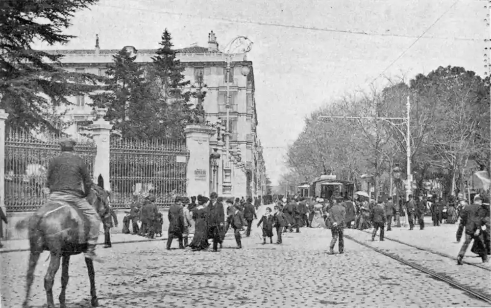 It would be difficult to find a word which would convey a true impression of a town, but if we were limited to the employment of a single term to describe Madrid, rococo would suggest itself. The capital is elegant, fanciful, and yet stately. It does not smile like Seville, nor frown like Toledo, and yet it is neither sad nor stern. Granada and Cordova sleep. Madrid never seems to slumber;{15} it is one of the most restless places upon the earth. It has the dignity of Castile and the frivolity of Paris; it exhibits the congestion of London in parts within its gates, but it has no dingy, sunless slums, and few signs of an ugly indigence.