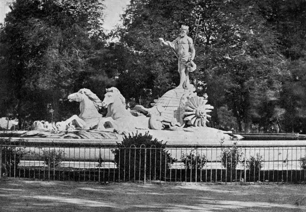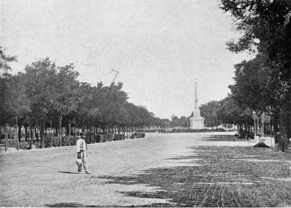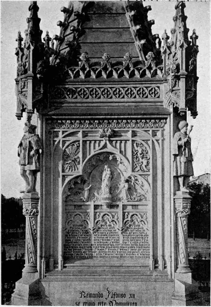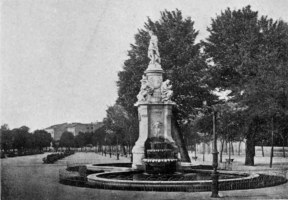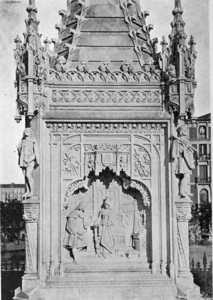 In several of the squares and promenades there are fountains, statues, and monuments. One of the finest of the monuments is that erected in memory of the heroes of the Dos de Mayo (the Second of May). It is of granite, in the shape of an obelisk, surrounded by symbolical figures. This monument was designed by Isidro Velazquez. A marble group in front of one of the façades of the Museo del Prado represents Daoiz and Velarde, the gallant artillery officers who fell on that occasion in defence of the throne and country.