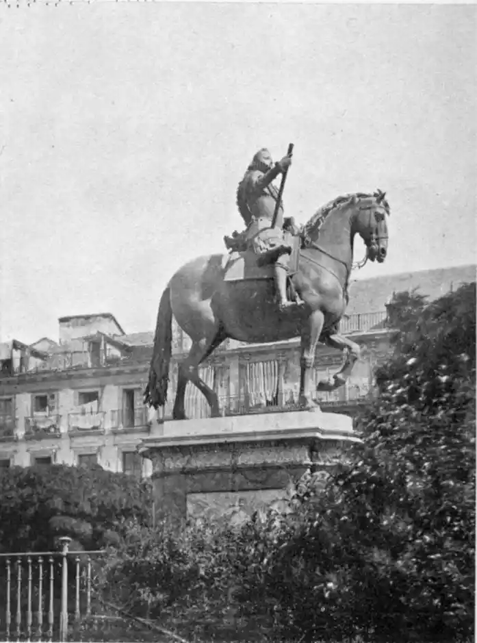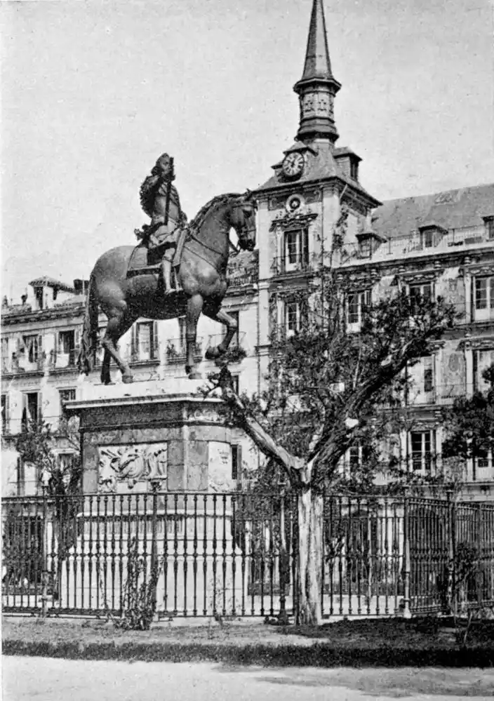 It was in the reign of Philip III. that the first part of Cervantes’ “Don Quixote” was printed in a house in the Calle de Atocha, by Juan de la Cuesta, and the great satire was published in 1605. Philip III. removed the Court to Valladolid, where it was maintained for about four years and then reinstated at Madrid. During the rule of Philip, the Plaza Mayor was built.