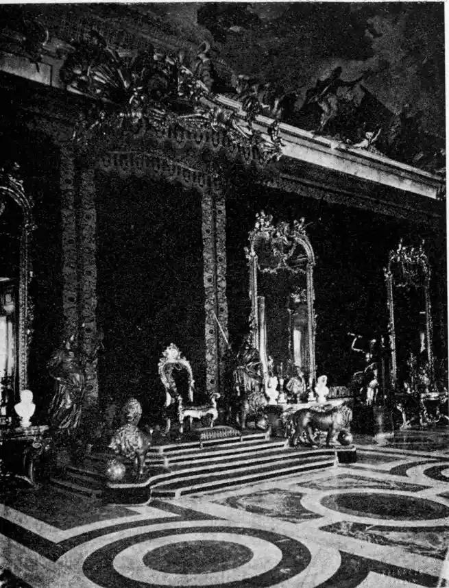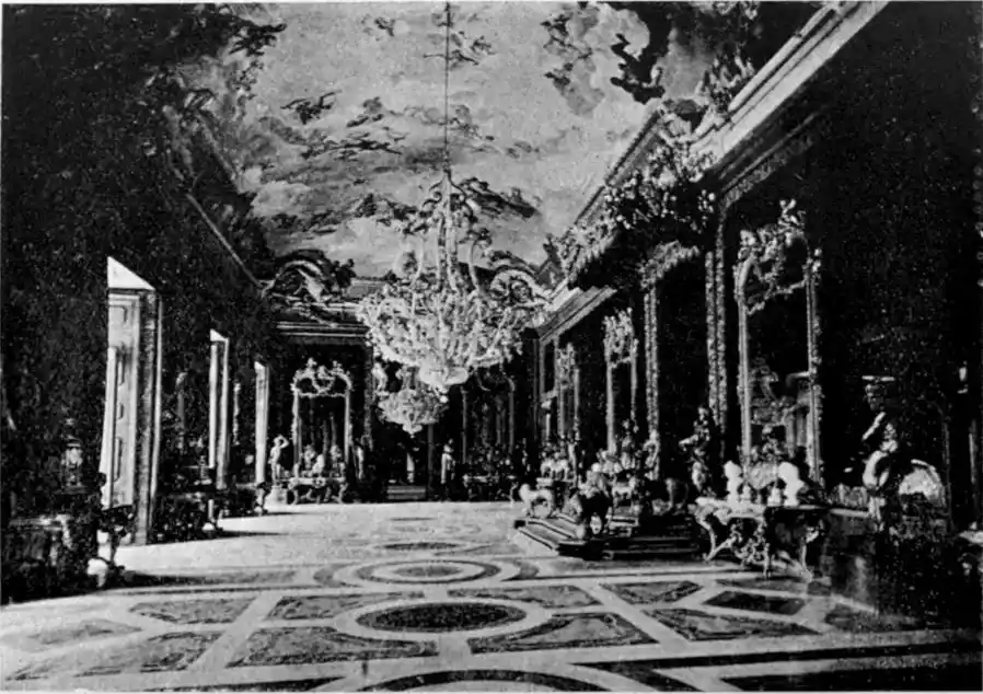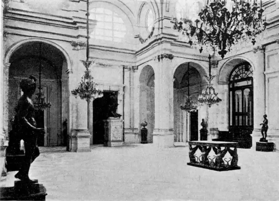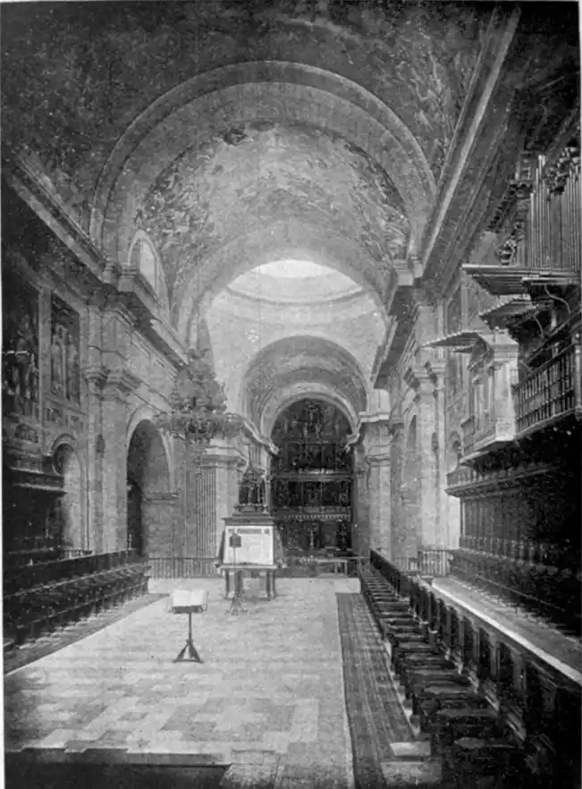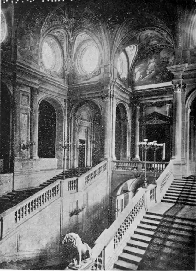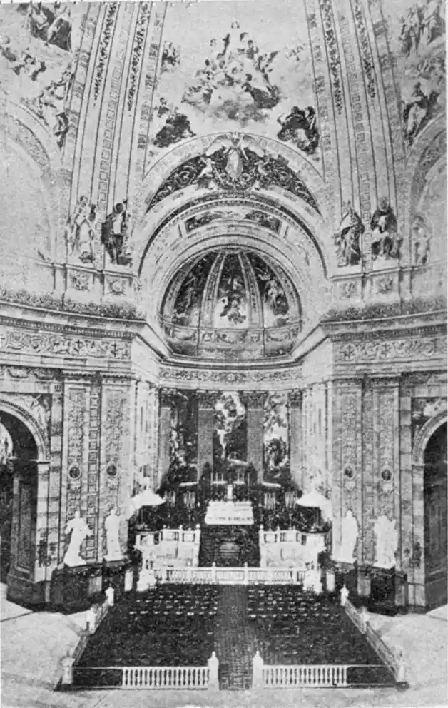 The grand staircase is of white and black marble, with an allegorical ceiling painting by the Italian Giacinto. In the sumptuous Throne-Room the appointments and decorations are resplendent, and on the ceiling is a picture representing the Majesty of Spain, painted by Tiepolo. Gasparini designed the beautiful hall that bears his name, where the ceiling is of porcelain, and the walls decked with satin upon which flowers are worked. The State Dining-Room of marble contains fresco paintings. The Royal Chapel has columns of marble, and above the altar is a painting by Mengs. Near the Sacristy are stored the holy relics; and in the Tapiceria there is a very fine collection of tapestries after Dutch artists. Attached to the Royal Palace are the Armoury, of which something will be said later, the Royal Stables, excellently appointed, and the sequestered and beautiful gardens.