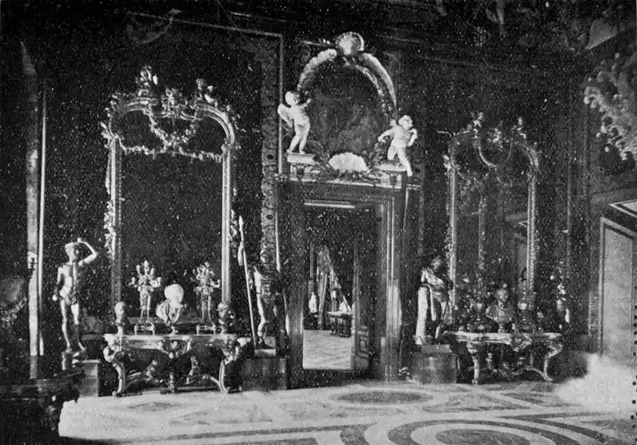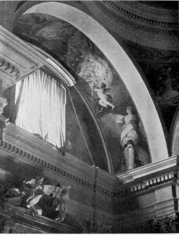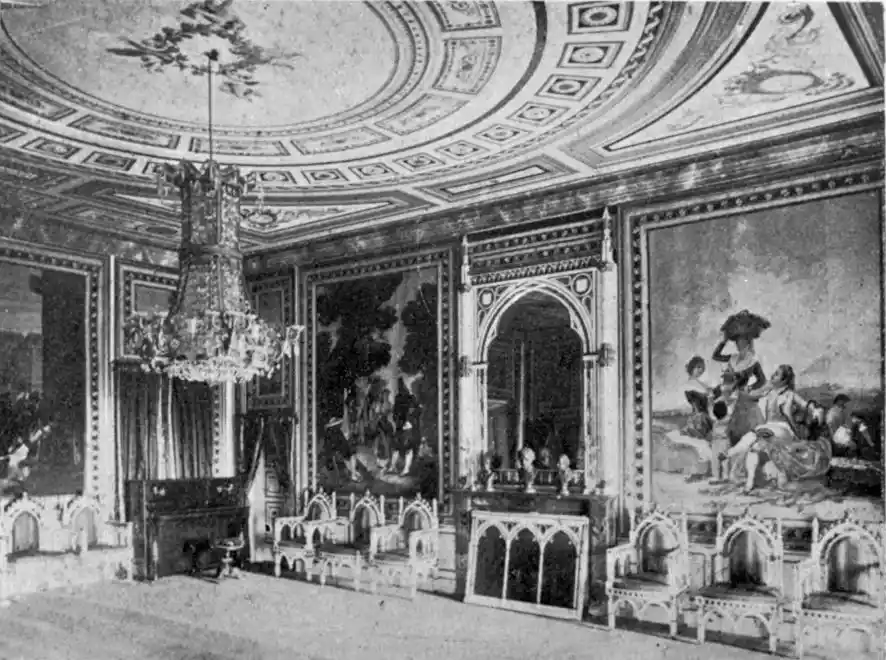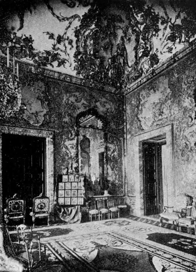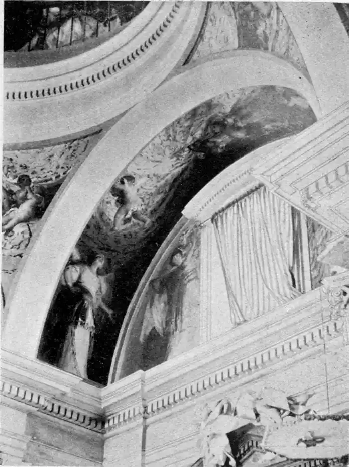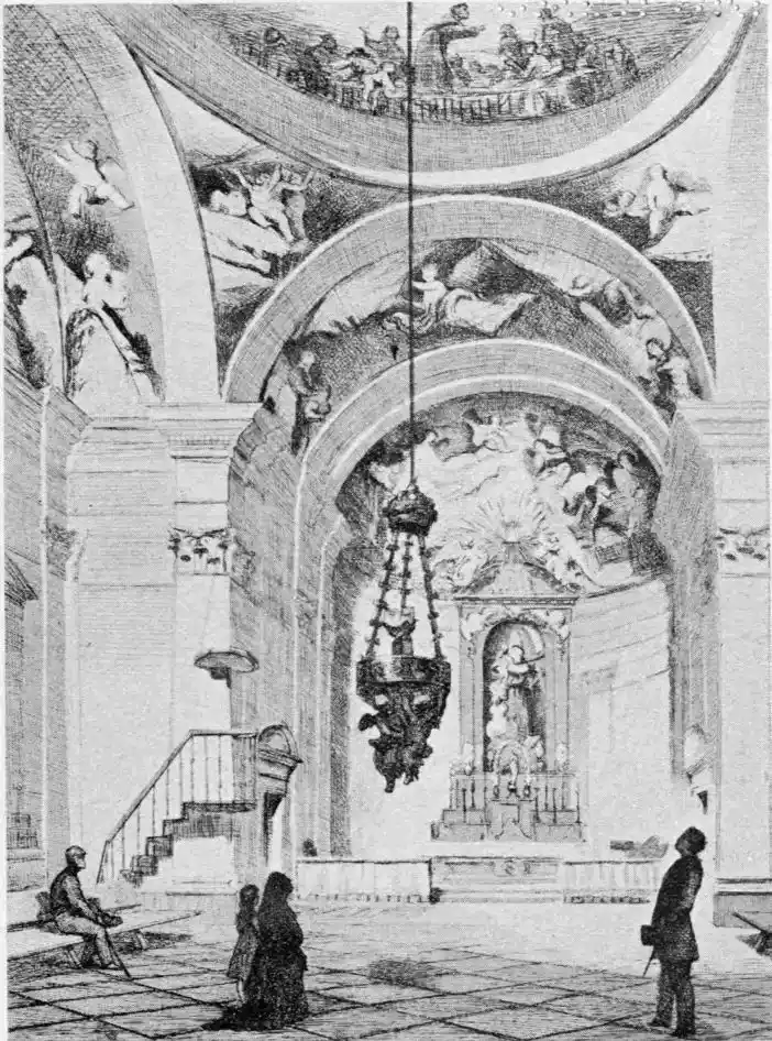 The grand staircase is of white and black marble, with an allegorical ceiling painting by the Italian Giacinto. In the sumptuous Throne-Room the appointments and decorations are resplendent, and on the ceiling is a picture representing the Majesty of Spain, painted by Tiepolo. Gasparini designed the beautiful hall that bears his name, where the ceiling is of porcelain, and the walls decked with satin upon which flowers are worked. The State Dining-Room of marble contains fresco paintings. The Royal Chapel has columns of marble, and above the altar is a painting by Mengs. Near the Sacristy are stored the holy relics; and in the Tapiceria there is a very fine collection of tapestries after Dutch artists. Attached to the Royal Palace are the Armoury, of which something will be said later, the Royal Stables, excellently appointed, and the sequestered and beautiful gardens.