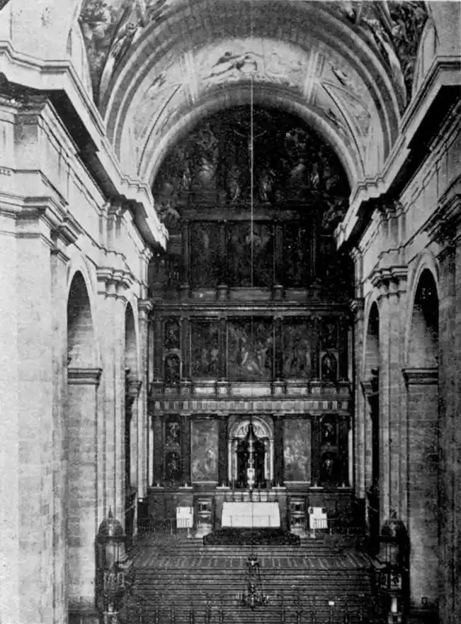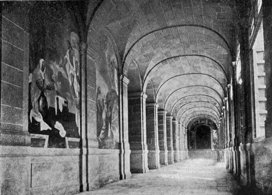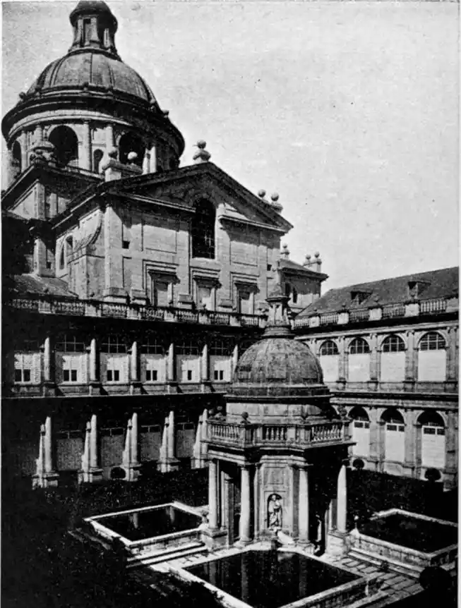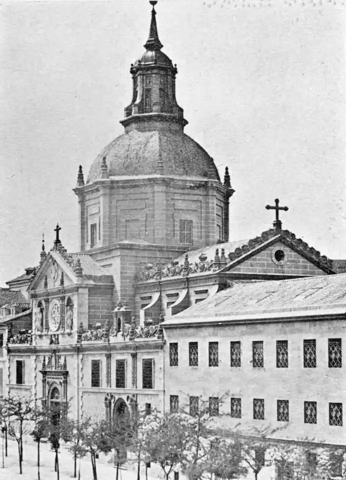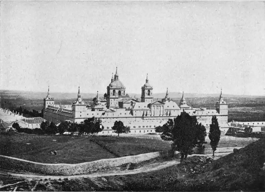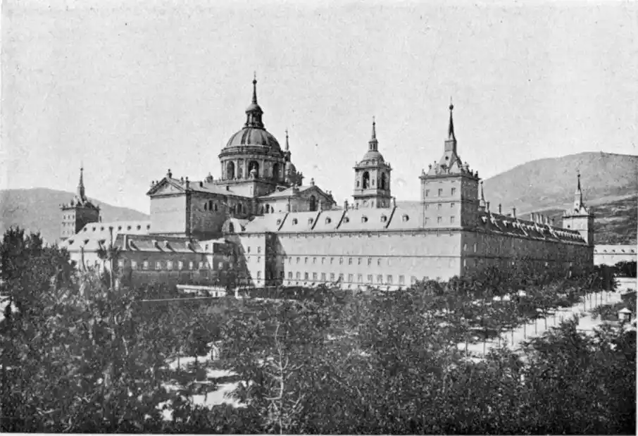 The Royal Palace, Monastery, and Mausoleum of El Escorial, which rears its gaunt, grey walls in one of the bleakest and most impossible districts in the whole of Spain, was erected to commemorate a victory over the French in 1557. It was occupied and pillaged by the French two-and-a-half centuries later, and twice it has been greatly diminished by fire; but it remains to-day, not only the incarnate expression of the fanatic religious character and political genius of Philip II., but the greatest mass of wrought granite which exists on earth, the leviathan of architecture, the eighth wonder of the world.{634}