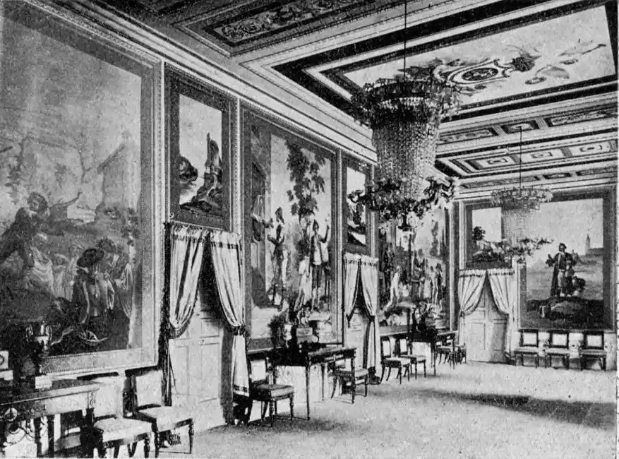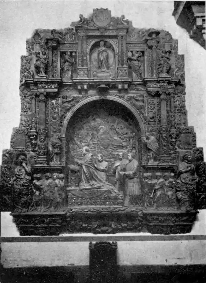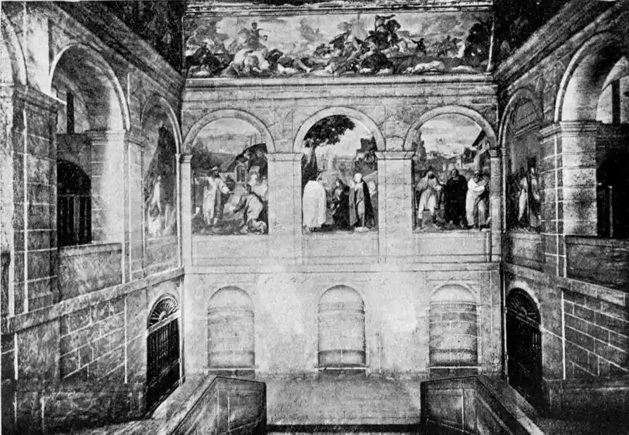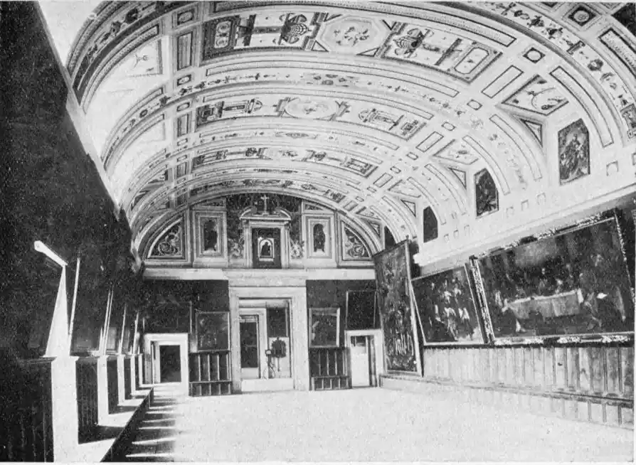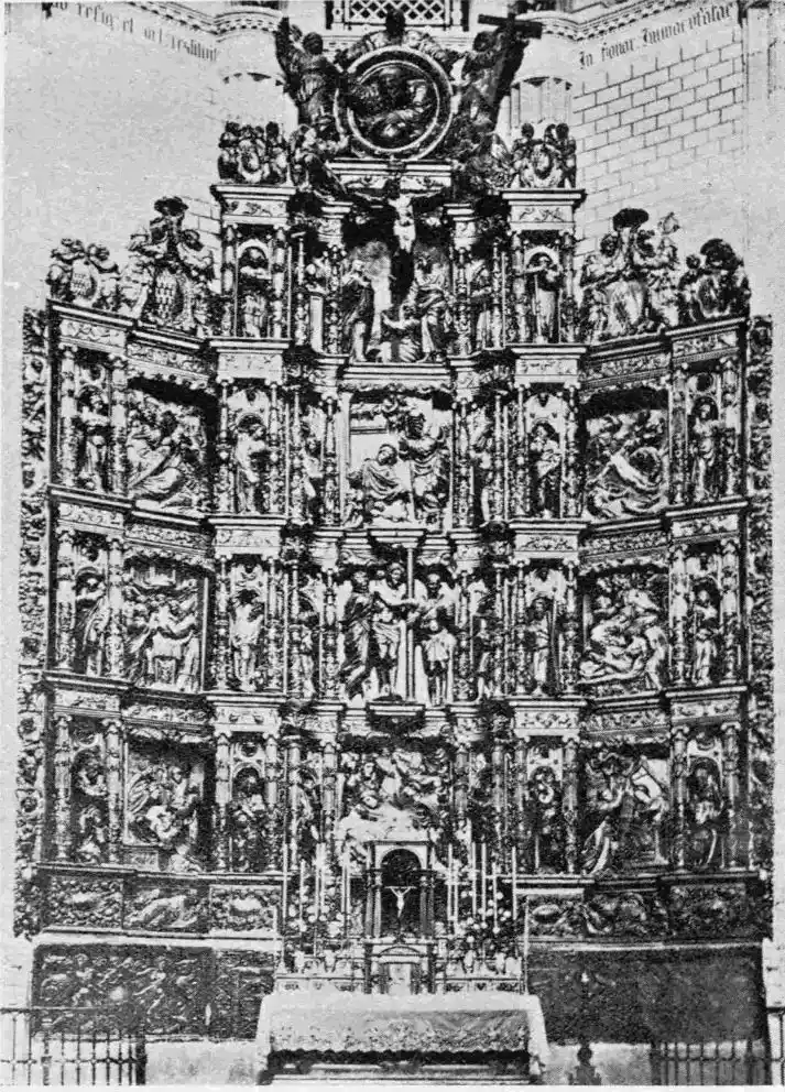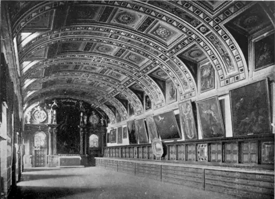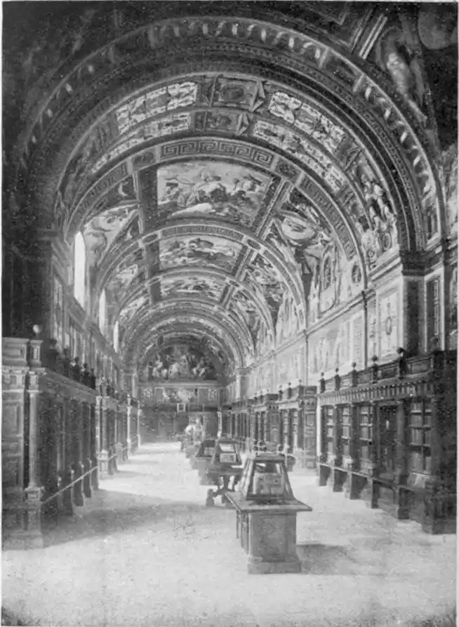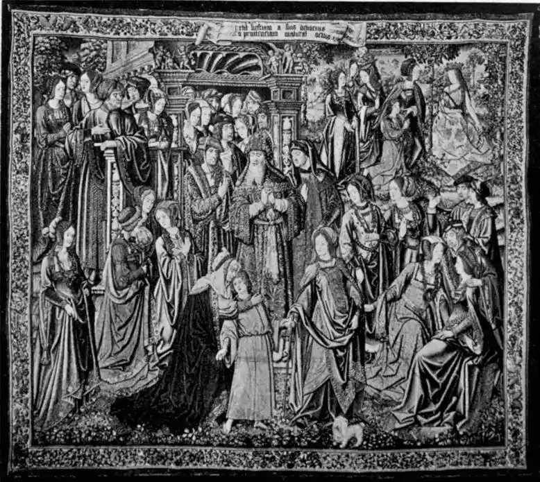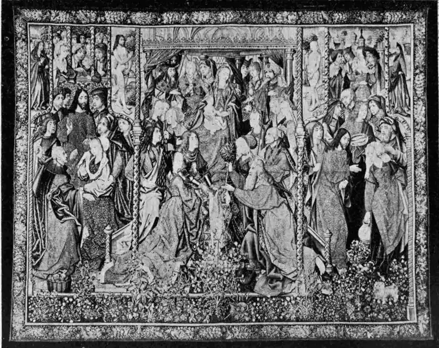 The Royal Palace at Madrid contains the most valuable and interesting collection of Tapestries in Europe. These were for the most part woven in Flanders, some in the early fifteenth century, at a time when the industry in that country had reached its zenith. At a later period the work of the Flemish artists was imitated in Spain itself with no little success. Among the designers of these superb works of art were Quentin Matsys, Pieter Breughel, and the Divine Raphael himself. Not artistically only but historically the collection is of rare interest.