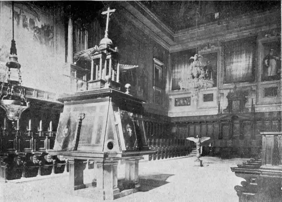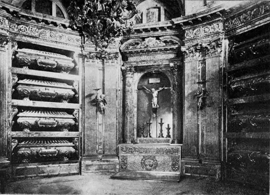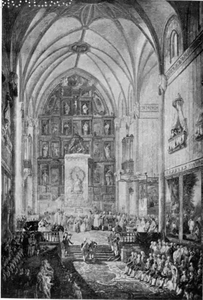 The royal infants are baptized from a font in which St Dominic, the immortal founder of the Friars Preachers, was christened. In the Royal Chapel of the Palace the weddings of the princes and princesses are celebrated, but the Kings are married in the Church of the Atocha.{37}