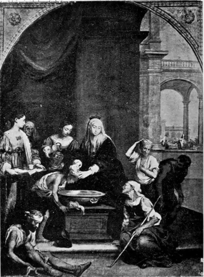 Ecclesiastical festivals form an essential part of the life of Madrid. The Forty Hours is celebrated at thirty churches of the city. During Holy Week there are impressive services and solemn processions in the streets. Every one walks garbed in black; diversions of every sort and all except indispensable business is suspended. A solemn hush reigns over the feverish city. Traffic in the thoroughfares is forbidden on Maundy Thursday and Good Friday, and the tramcars do not run during certain hours. On Maundy Thursday the King washes the feet of twelve indigent men and women in the palace, and the public attend the ceremony. Good Friday is a day of grace, when the King, at his discretion, exercises clemency towards criminals accused of capital charges.