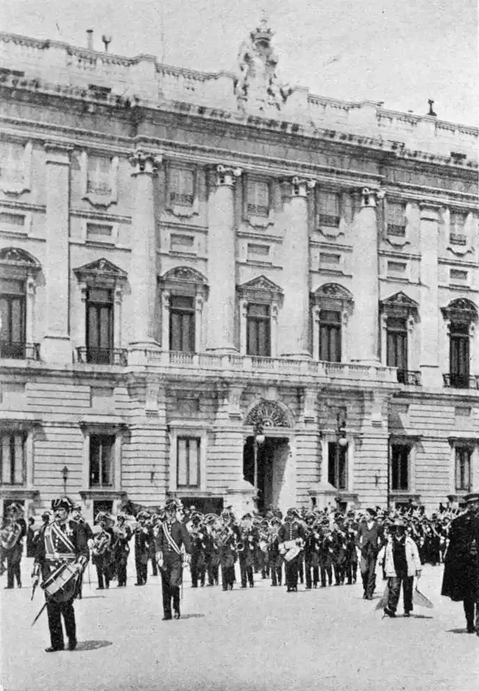 The changing of the royal guard takes place every morning in the grounds of the palace, and is an interesting military spectacle, which attracts a large number of the natives of Madrid as well as visitors to the city. It dates from the time of Charles III. A regimental band plays during the ceremony under the windows of the palace.