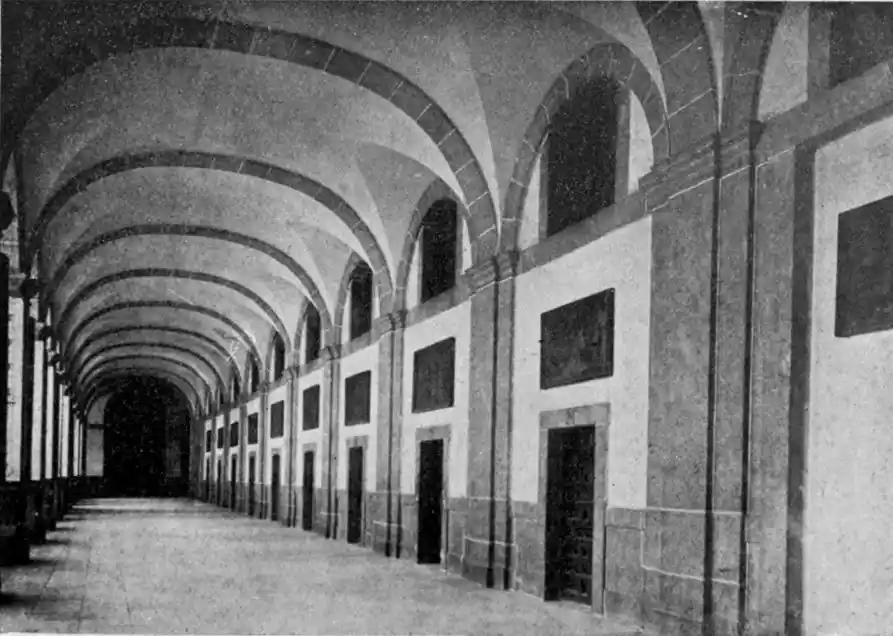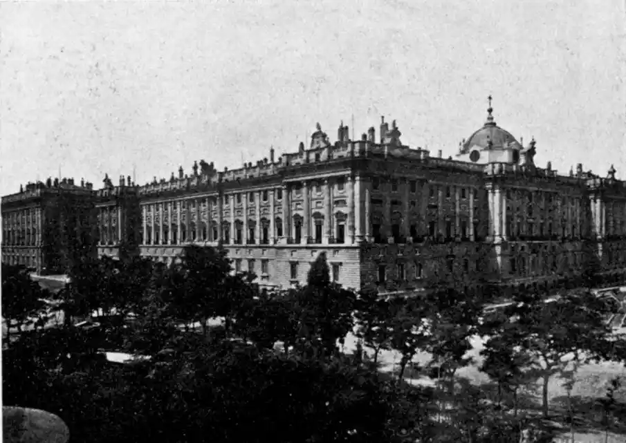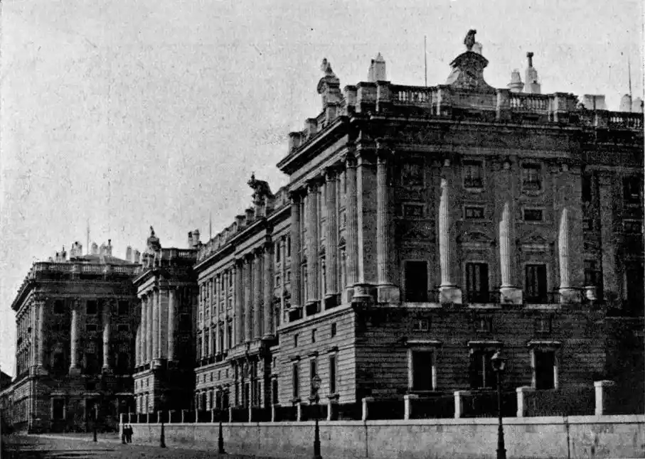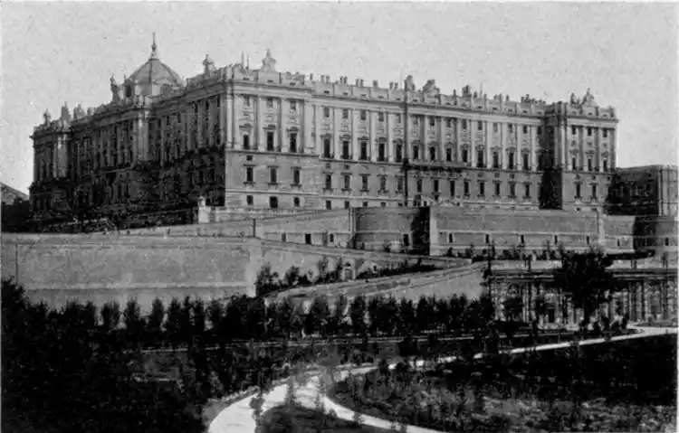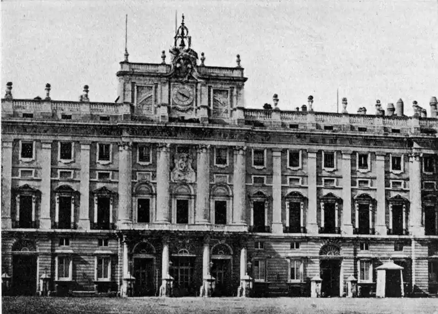 The modern Palacio Real is rectangular, and stands on an eminence commanding a wide view of the undulating tableland and the distant mountains of Castile. It is built of granite and has wide wings. The chief façade is on the south side. The Princes’ Entrance is one of the several doorways of the fine façade. On the north is another portal of admirable design, leading to the great patio or inner court. The court is sur{33}rounded by a piazza on thirty-six arches with the same number of arches above, forming a gallery; and in the square are statues of the Roman Emperors who ruled in Spain.
