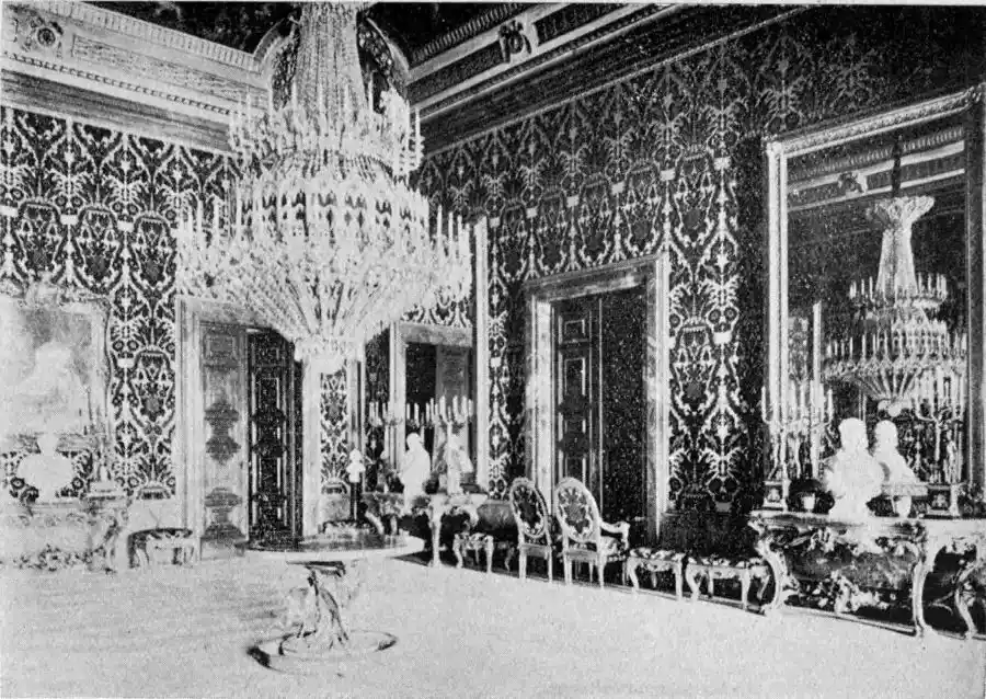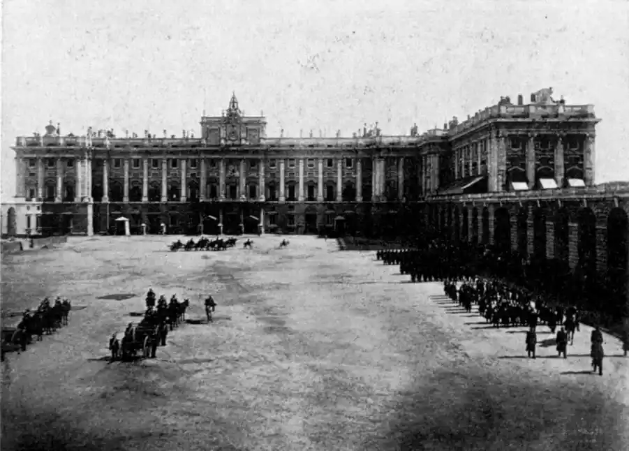 The Chief Chaplain to the King is the Archbishop of Toledo. One of the principal members of the household is the Keeper of the Queen’s Wardrobe. Then come the Lords of the Bedchamber, Maids of Honour, and the Mayordomos de Semana (of the Week). The military officer in command is the General of the Royal Halberdier Guards, and this functionary presides over the ceremony of opening the palace doors at six in the morning and closing them at eleven at night. In Spain the royal residences are regarded as fortresses, and protected by troops.