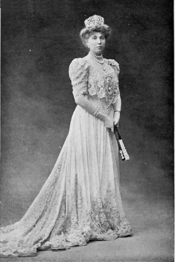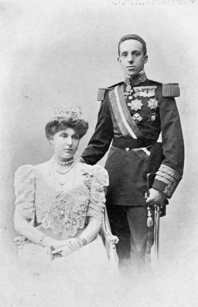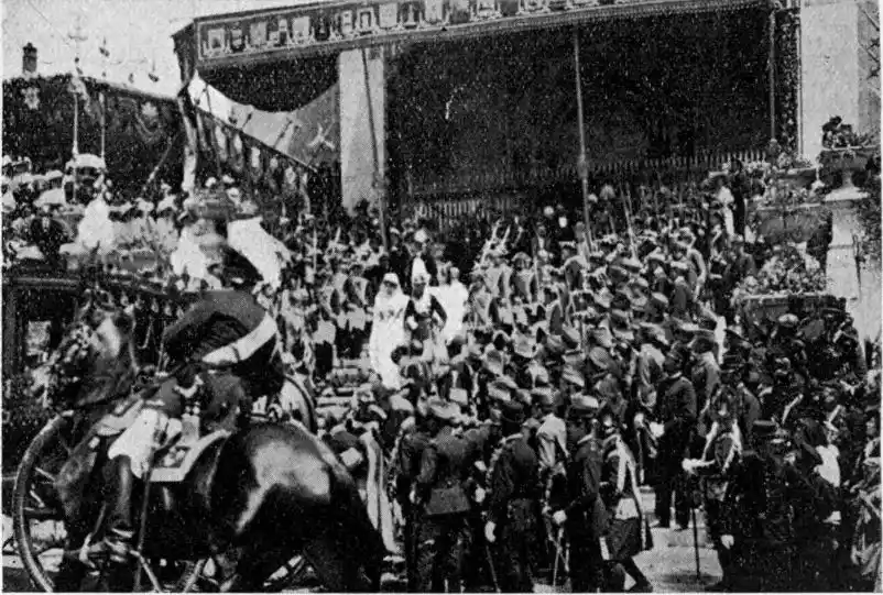 Uniform or court dress is worn by the King at these religious celebrations, the Queen always wearing a black or white mantilla, and a long train to her dress, which is borne by pages. The sovereign sits under a canopy, and the princes and princesses are on either side of the throne. Each grandee of the Court has his allotted seat.