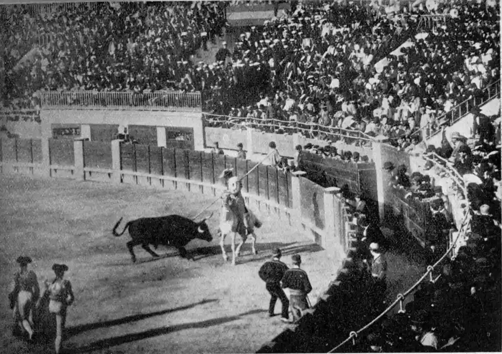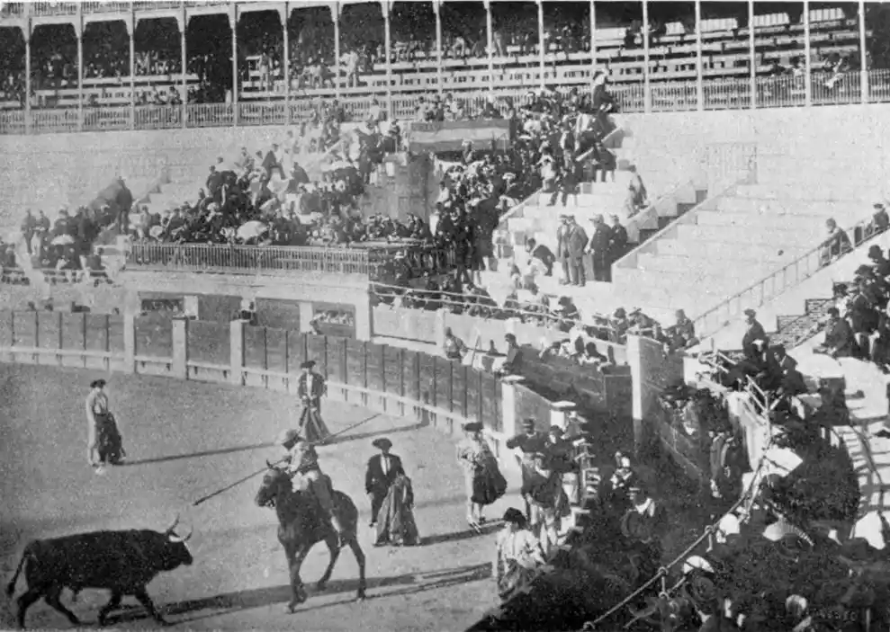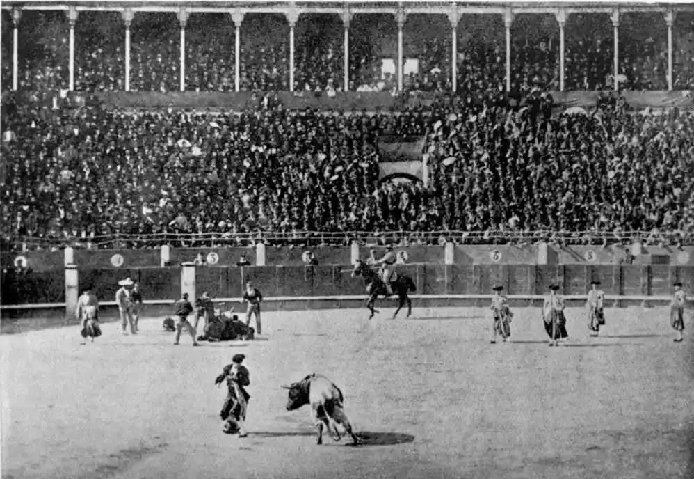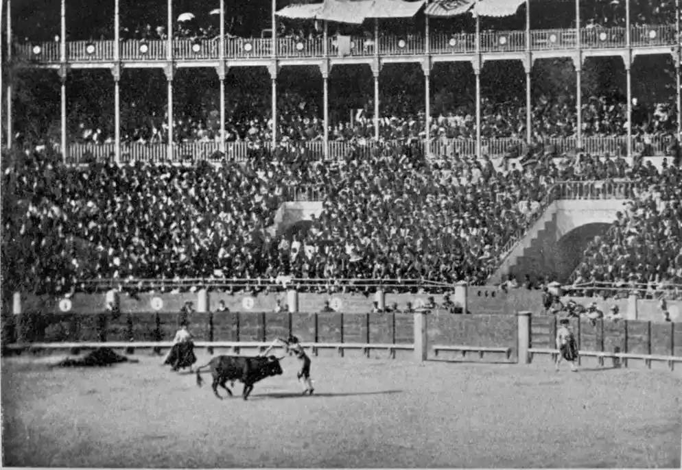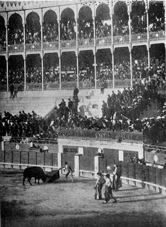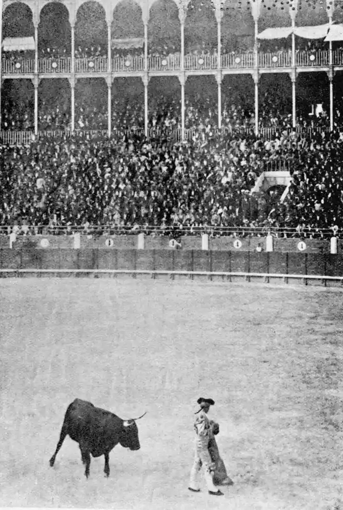 There is the Madrid of the casinos, some intellectual, others merely social or sporting. The city has its coteries of ardent politicians, military men, financiers, reformers, freethinkers, revolutionaries, and its societies of the scientific, learned, and artistic. There is no specific character which one can point to as typical of Madrid. One passion is, however, manifest throughout all classes—the love of bull-fighting. Seville is the school of the torero; Madrid is the scene of his valour in the arena. The bull-fighter is the idol of the populace. In the cafés of the Puerta del Sol, or in the ring of the Plaza de Toros, his figure{16} is one that arouses the deepest interest and warmest admiration. An eminent jockey in England has his host of admirers, but he cannot command that universal respect which is accorded to the espada in Spain. The great bull-fighter is the pet of Madrid society, the demi-god of the populace, the model of the “sports” of the city.