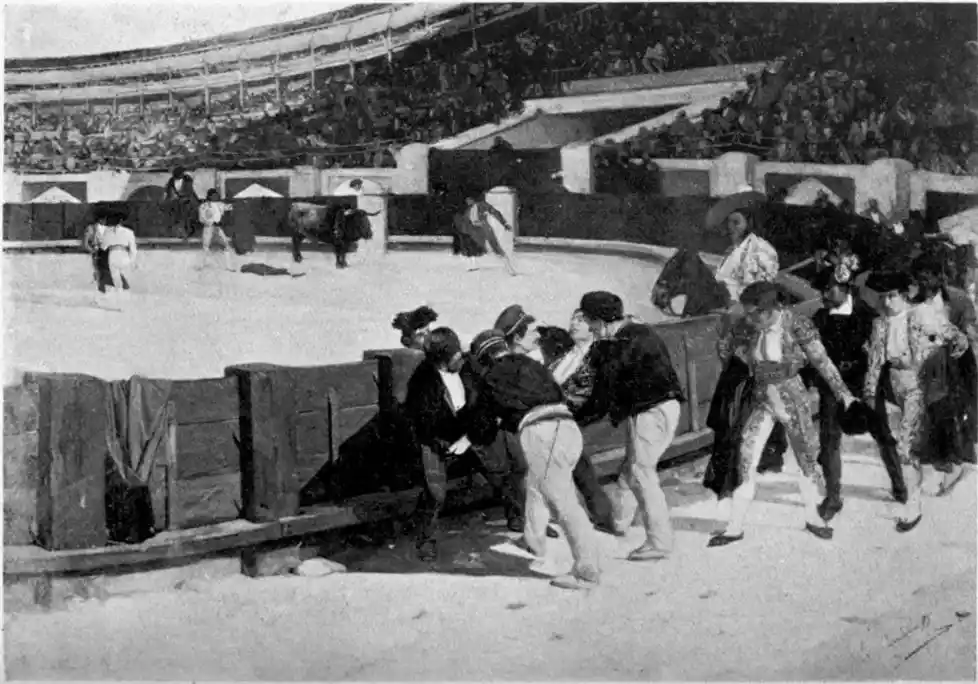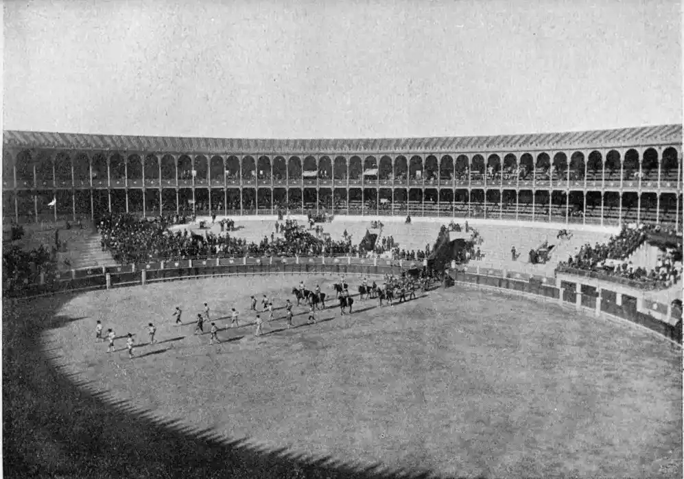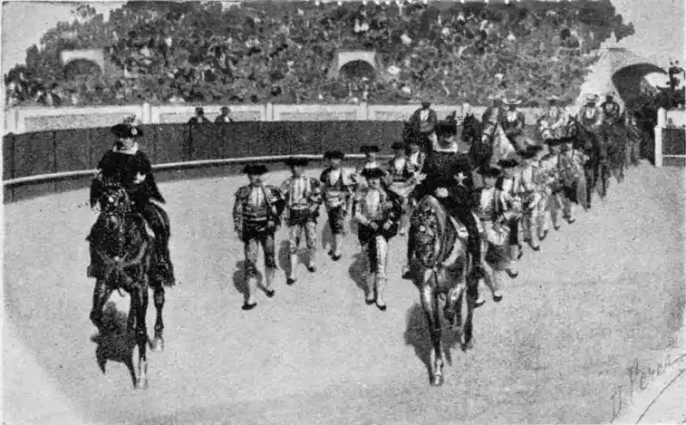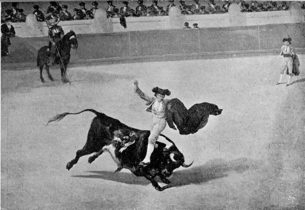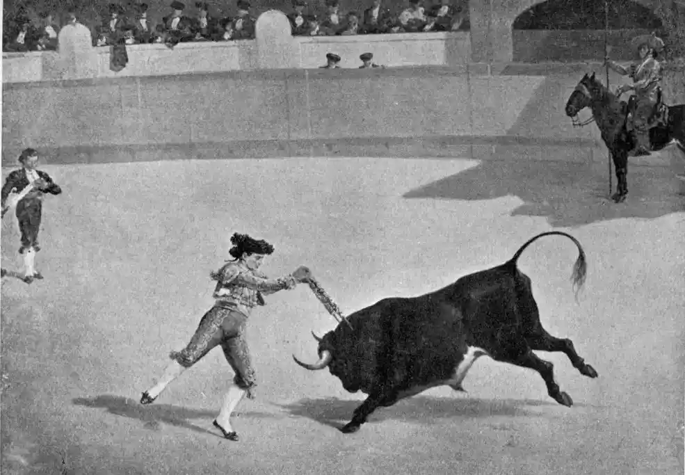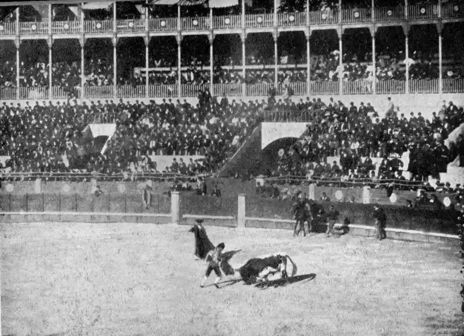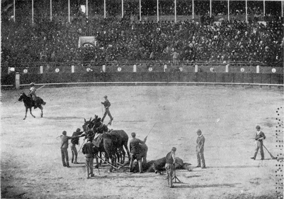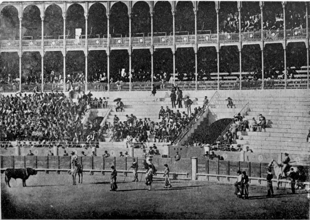 There is the Madrid of the casinos, some intellectual, others merely social or sporting. The city has its coteries of ardent politicians, military men, financiers, reformers, freethinkers, revolutionaries, and its societies of the scientific, learned, and artistic. There is no specific character which one can point to as typical of Madrid. One passion is, however, manifest throughout all classes—the love of bull-fighting. Seville is the school of the torero; Madrid is the scene of his valour in the arena. The bull-fighter is the idol of the populace. In the cafés of the Puerta del Sol, or in the ring of the Plaza de Toros, his figure{16} is one that arouses the deepest interest and warmest admiration. An eminent jockey in England has his host of admirers, but he cannot command that universal respect which is accorded to the espada in Spain. The great bull-fighter is the pet of Madrid society, the demi-god of the populace, the model of the “sports” of the city.