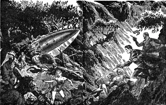 He glanced at his all-too-tiny fighting crew. Bert Andrews, old J. Foster, Breadon, Sparks, himself. "Tommy," he ordered, "go back into the cave!"