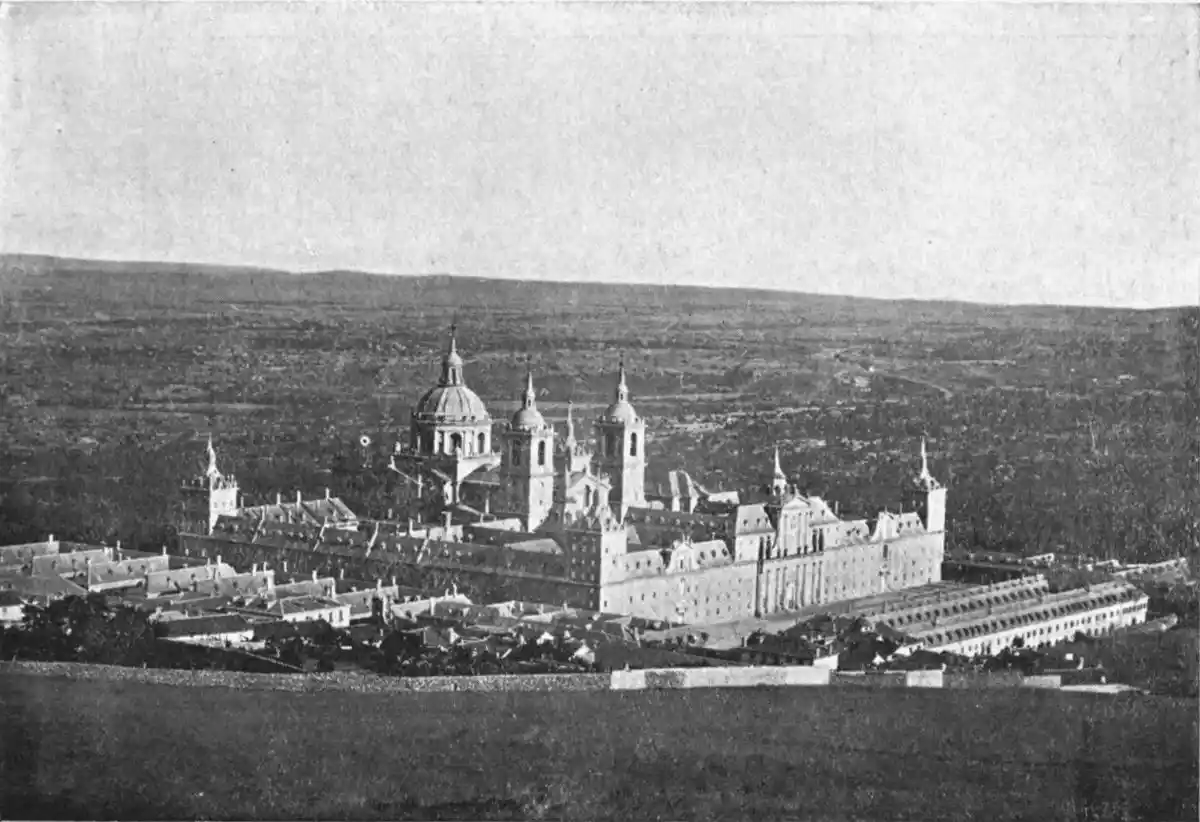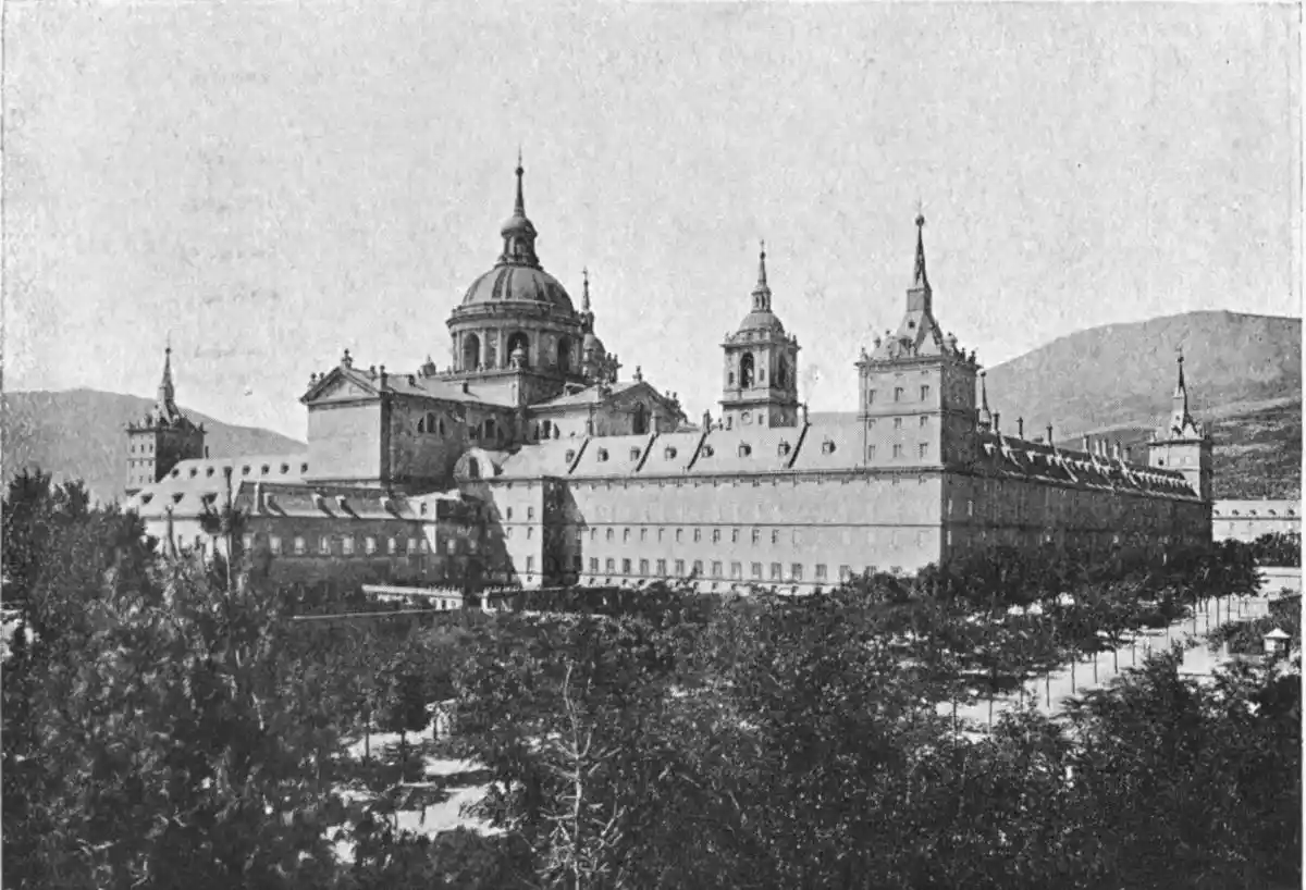 Although located in a desolate waste of rugged mountains and treeless plains, amid surroundings which most men would shun, the site of the Escorial was selected as the result of much careful thought and personal investigation by ‘the holy founder,’ as Philip is called by the monks. His sentimental attachment to the spot is explained by its air of unrelieved melancholy, but he was also influenced in his choice by the fact that the district contained the abundance and quality of stone suitable for his purpose. Already he had conceived the form and dimensions of his hermitage and sanctuary, the austerity and magnitude of which were to be in harmony with its natural surroundings. Before the work of clearing the land was begun he had erected upon the newly acquired site a rude temporary lodging for his own accommodation. He entrusted his ideas for the construction of the building to Juan Bautista de Toledo, whose plans, ambitious and eccentric in the first place, were severely revised by Philip. On April 23, 1563, the first stone was laid, and from that time until September 13, 1584, when the pile was completed, the king, assailed by the fear that he might die before his scheme was brought to completion, devoted every moment he could seize{7} from affairs of State to superintending the work, and urging architects, artists, and decorators to greater efforts in the accomplishment of their several tasks.
