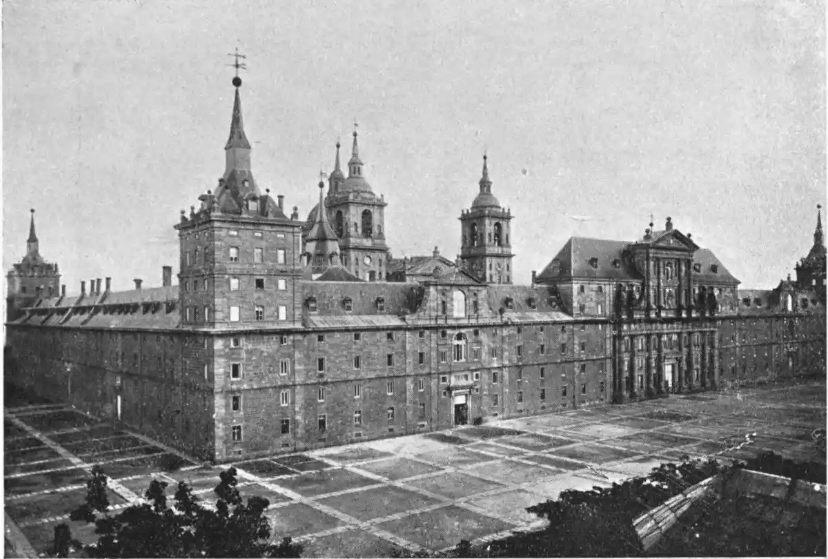 It must be admitted that, at first sight, the Escorial produces a feeling of disappointment; the first impression of the clean granite, the blue slates, and the leaden roofs is not wholly pleasing. But as one approaches this ‘grandest and gloomiest failure of modern times,’ the size and simplicity of the ashy-coloured pile takes posses{11}sion of the imagination, its sombreness and its austere magnificence stands out more and more clearly from its sombre and magnificent surroundings, and one begins to realise something of the spirit of the place and of the character of the man that called it into being. The edifice is a rectangular parallelogram, having a length of 744 feet from north to south, and a depth of 580 feet. It has been said that the architecture exhibits a series of solecisms which would have shocked the disciples of Vignola and Palladio, but Mr. Fergusson in his History of the Modern Styles of Architecture declares that the whole design shows more of Gothic character than the masterpieces of Wren and Michael Angelo.