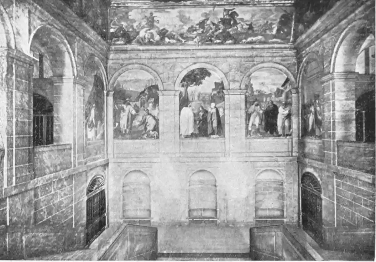 The Royal School of Alfonso XII., which occupies the north-east end of the edifice, is entered from the principal façade. Among its many and notable apartments is the spacious and magnificent paraninfo, the ceiling of which is formed by a painting of extraordinary size, which is believed to have been painted by the pupils of Jordán. Two smaller paintings represent symbolical figures of different sciences, and are signed by Llamas. Near the paraninfo are the fine Physics and Natural History rooms, the lucerna or light court, and{18} the children’s dining-rooms, adorned with a collection of pictures representing incidents in the life of Alexander. These were painted for the palace of San Ildefonso by order of Philip V., and they are all signed by eminent Italian artists. Over the paraninfo is another fine room, the centre of which is occupied by a beautiful statue of St. Augustine, carved in wood, conceived and executed by the lay-friar S. Cuñado to commemorate the fifteenth centenary of the conversion of St. Augustine.