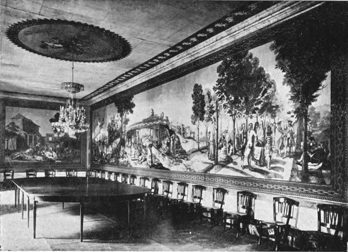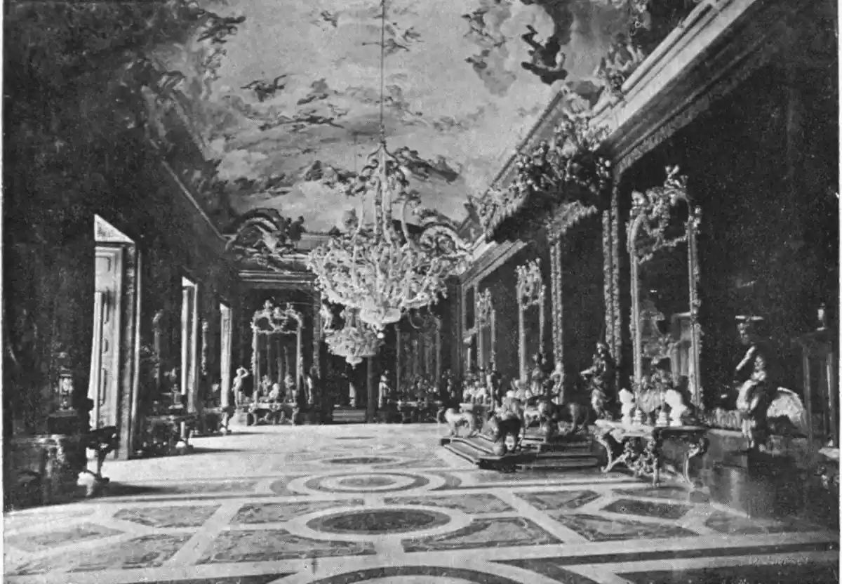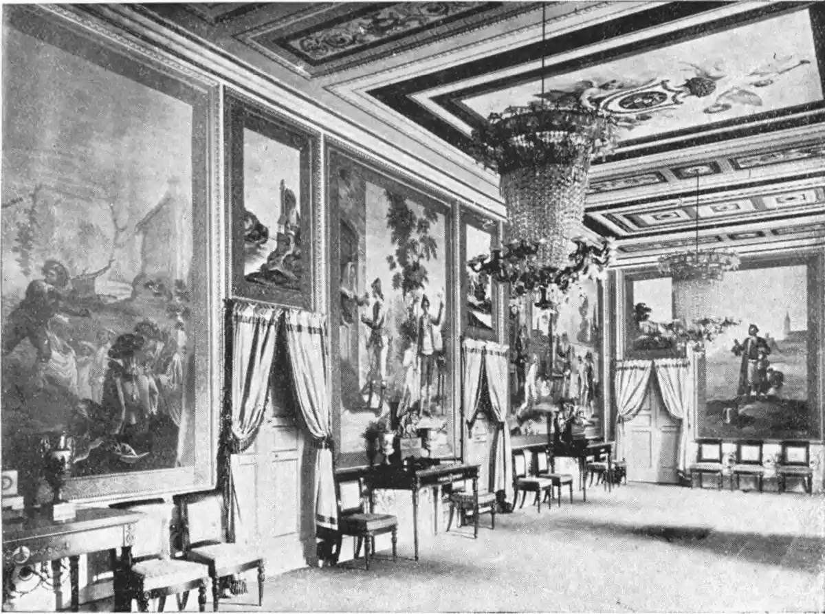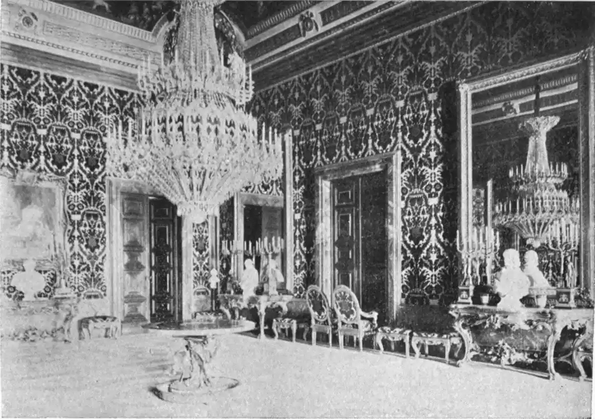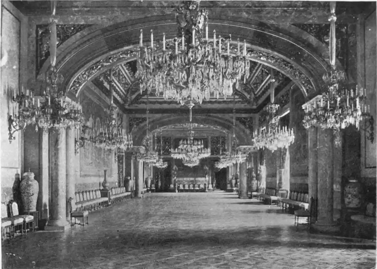 The Guard Room, occupied by the Royal Halberdiers, is at the head of the Royal Staircase, and opens into the enormous Hall of Columns. The columns which support the corner medallions are similar to those on the staircase, and the ceiling is painted by Conrado Giaquinto. The paving is of variegated marbles; the only decorations of the apartments are its medallions, its cornices of trophies, and its four great allegorical figures. For its impressiveness the room depends solely on its architectural merits and{101} its simplicity, and forms a striking contrast to the other salons of the palace with their superb tapestries, upholstered furniture, brocades, and ornaments. The Banqueting Hall is of magnificent proportions, and the Ball Room, to the splendour of which all the arts and manufactures appear to have contributed, is the largest in Europe. The Chinese Room, the Charles III. Room, hung with blue brocade starred with silver, and the Giardini Room, which is upholstered in ivory satin, embroidered in gold and coloured flowers, and roofed with porcelain from the Buen Retiro factory, are among the many marvels of this marvellous palace.